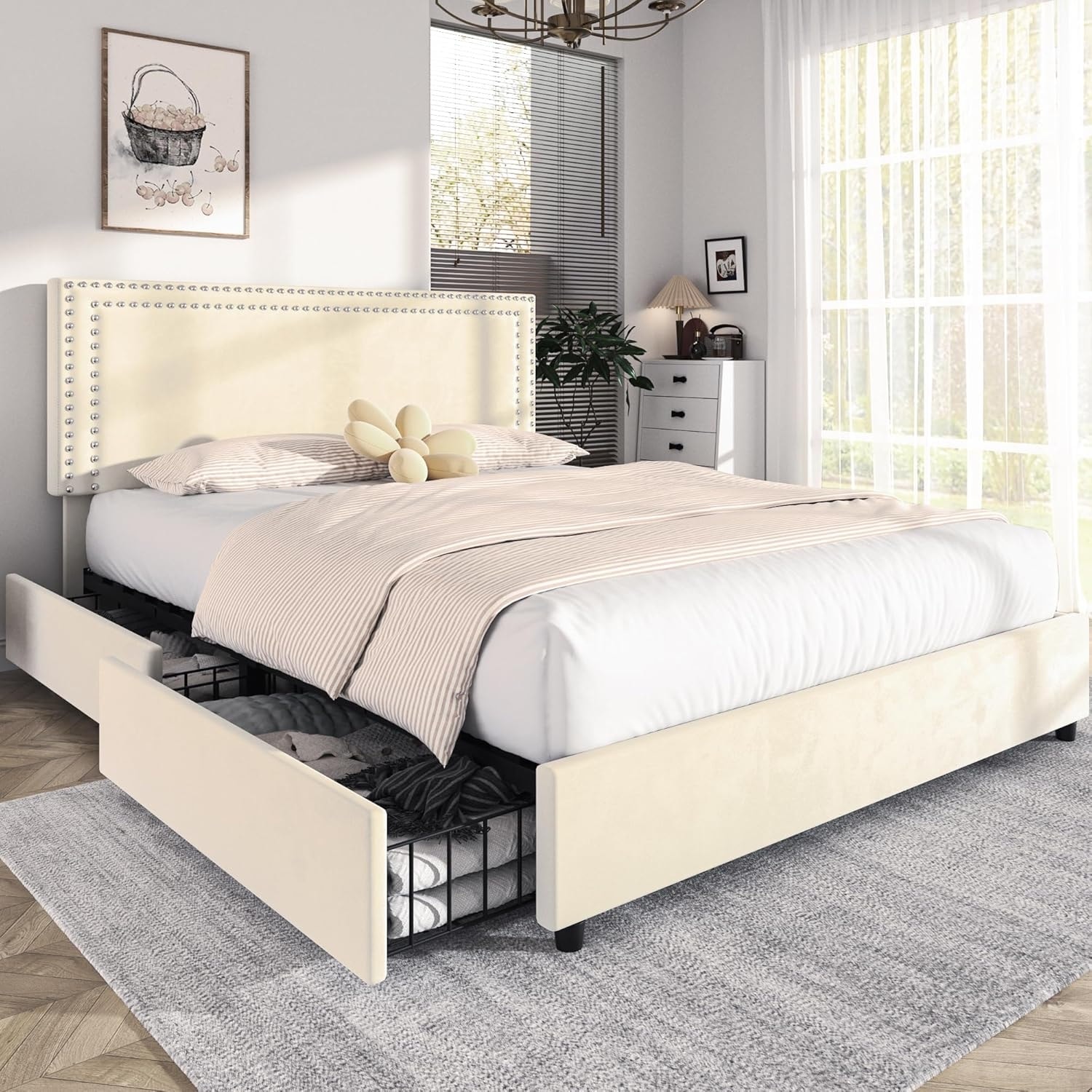 Queen Size Upholstered Platform Bed with Storage Drawers, Adjustable Velvet Headboard, Wooden Slats, Easy Assembly