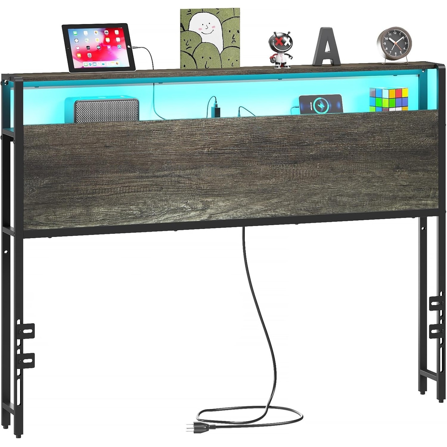 Full Bed Headboard with Storage Shelves, Charging Station, USB Ports, and RGB LED Lights, Black Oak