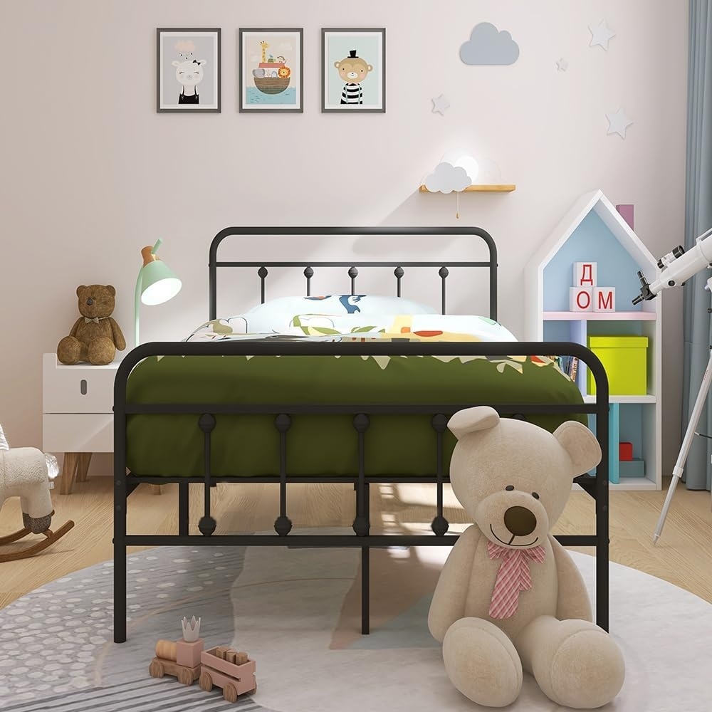 Twin Size Metal Bed Frame with Vintage Headboard, Sturdy Steel Slat Support, Easy Assembly, Black