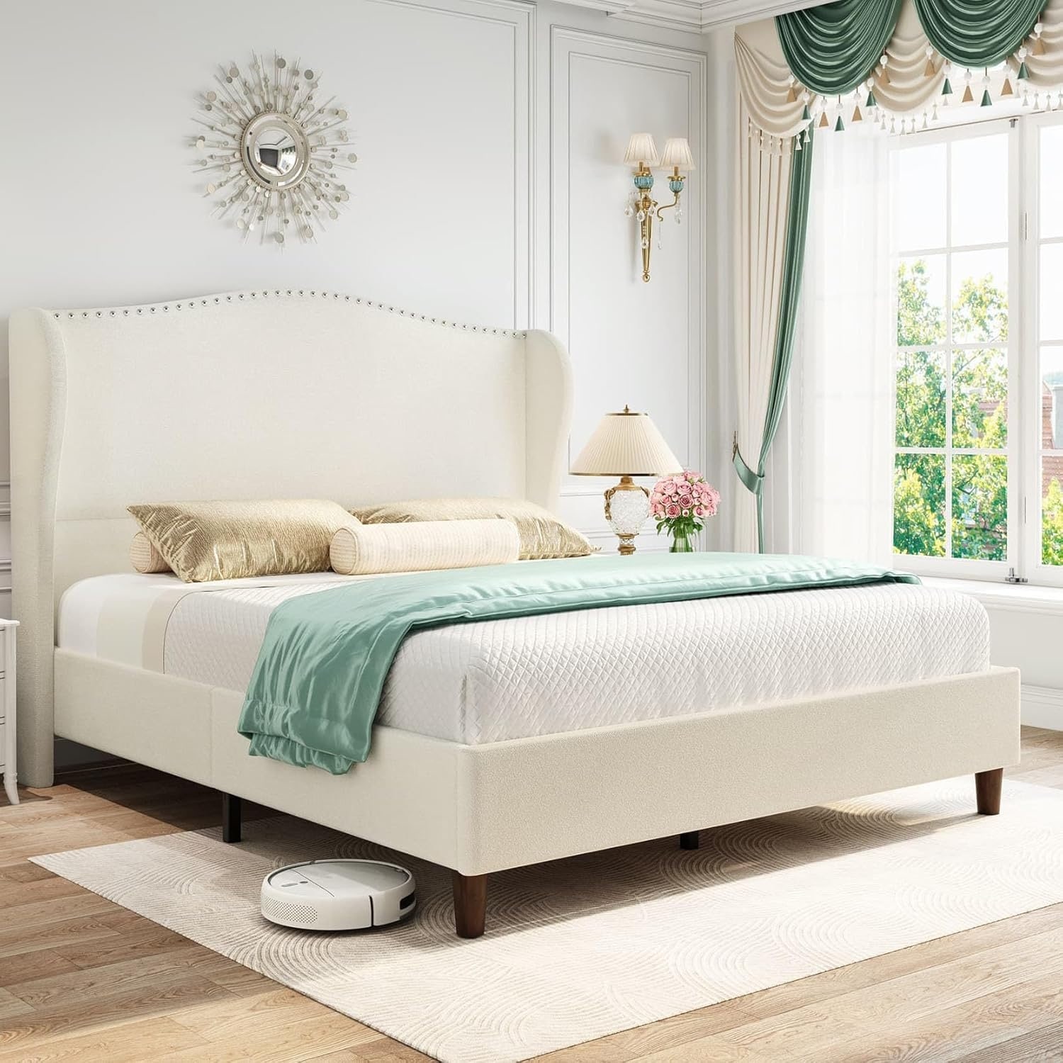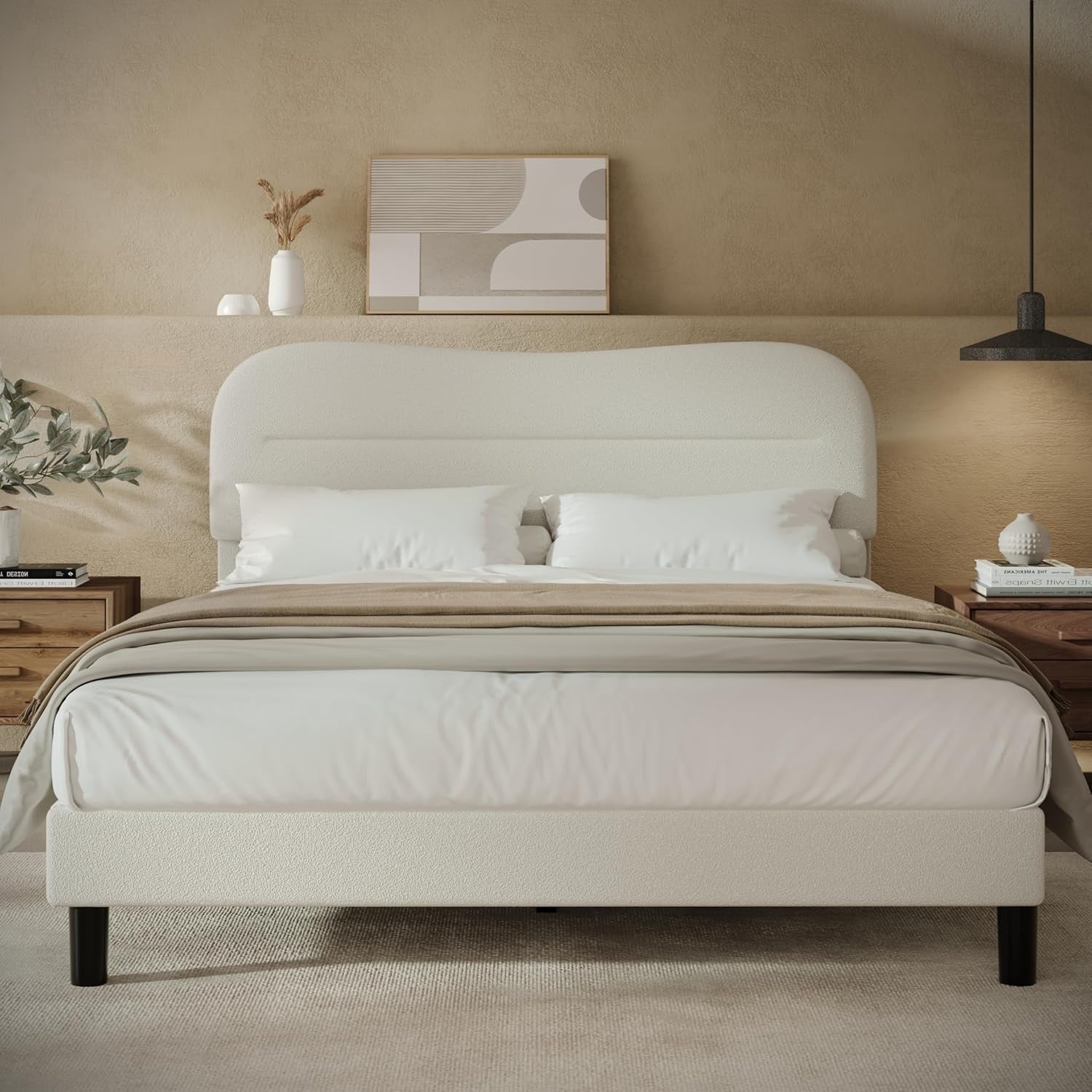 Queen Size Upholstered Bed Frame with Soft Boucle Fabric Headboard, Noise Free, No Box Spring Needed