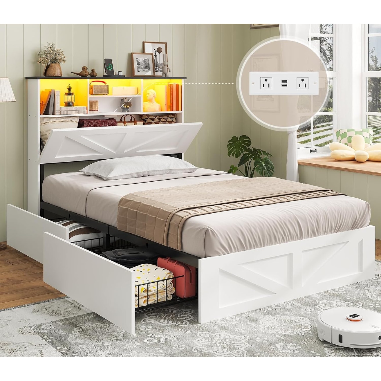 Farmhouse Twin Bed Frame with Storage Drawers, Charging Station, LED Lights, and Hidden Space