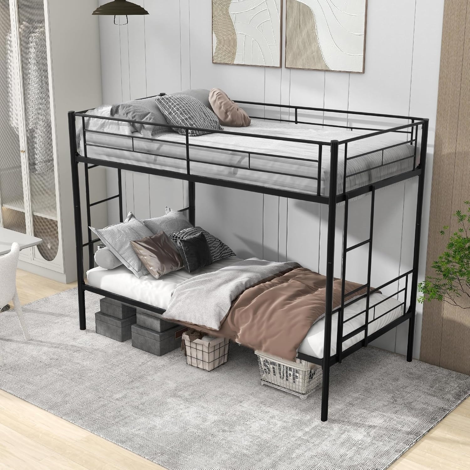 Twin Over Twin Metal Bunk Bed with Ladder, Safety Rail, and Space-Saving Design for Kids, Teens, and Adults