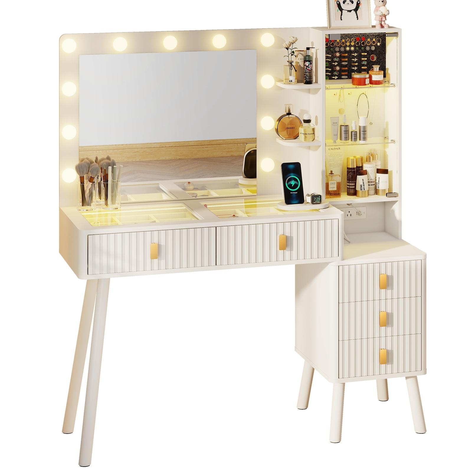 White Vanity Desk with Mirror and Lights - 2 USB Ports, 3 Drawers + 2 Cabinets, 7 Lights (3 Colors), Foldable 3-Side Mirror