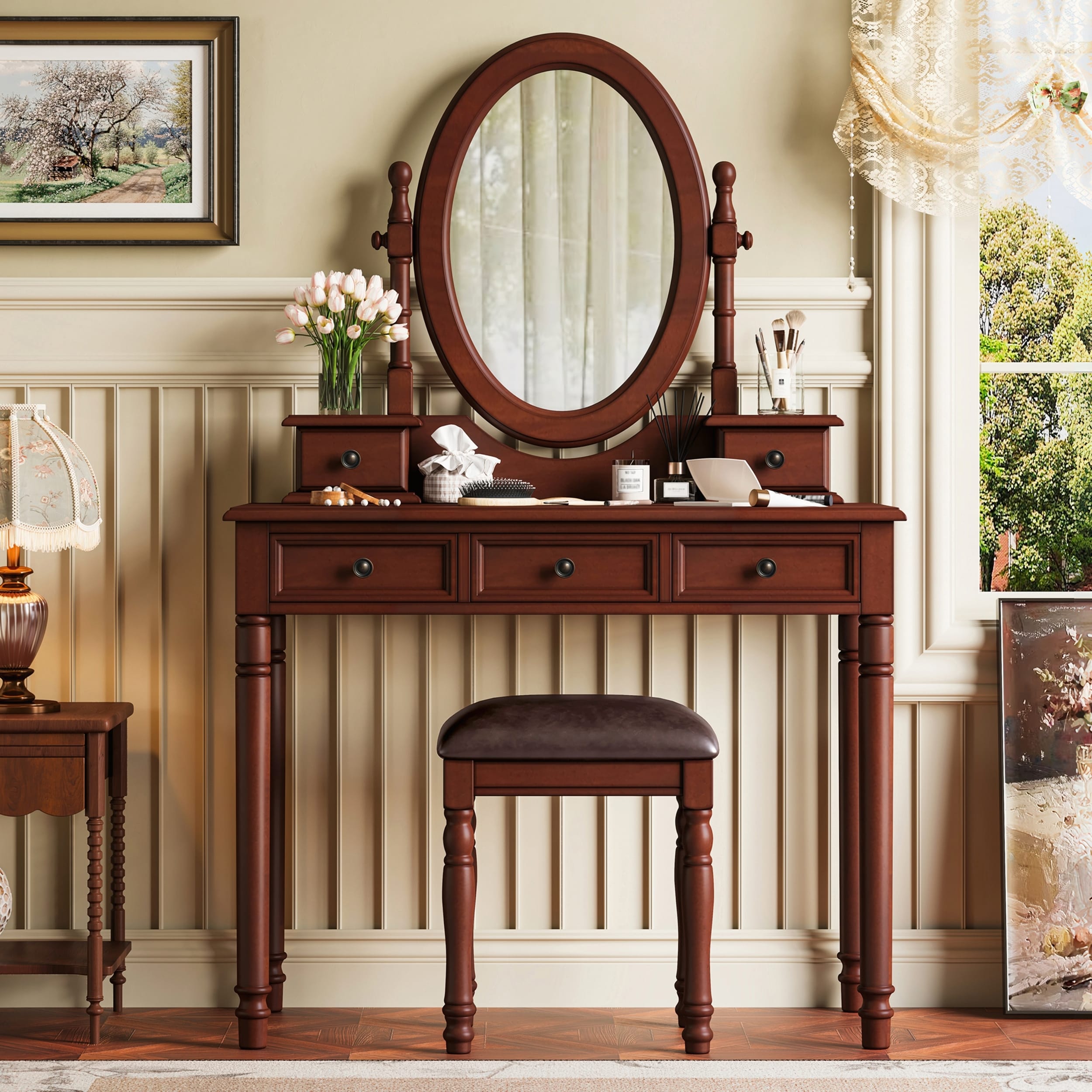 Vintage Vanity Desk with Adjustable Mirror, Cushioned Stool, and 5 Velvet-Lined Drawers for Elegant Bedroom Decor