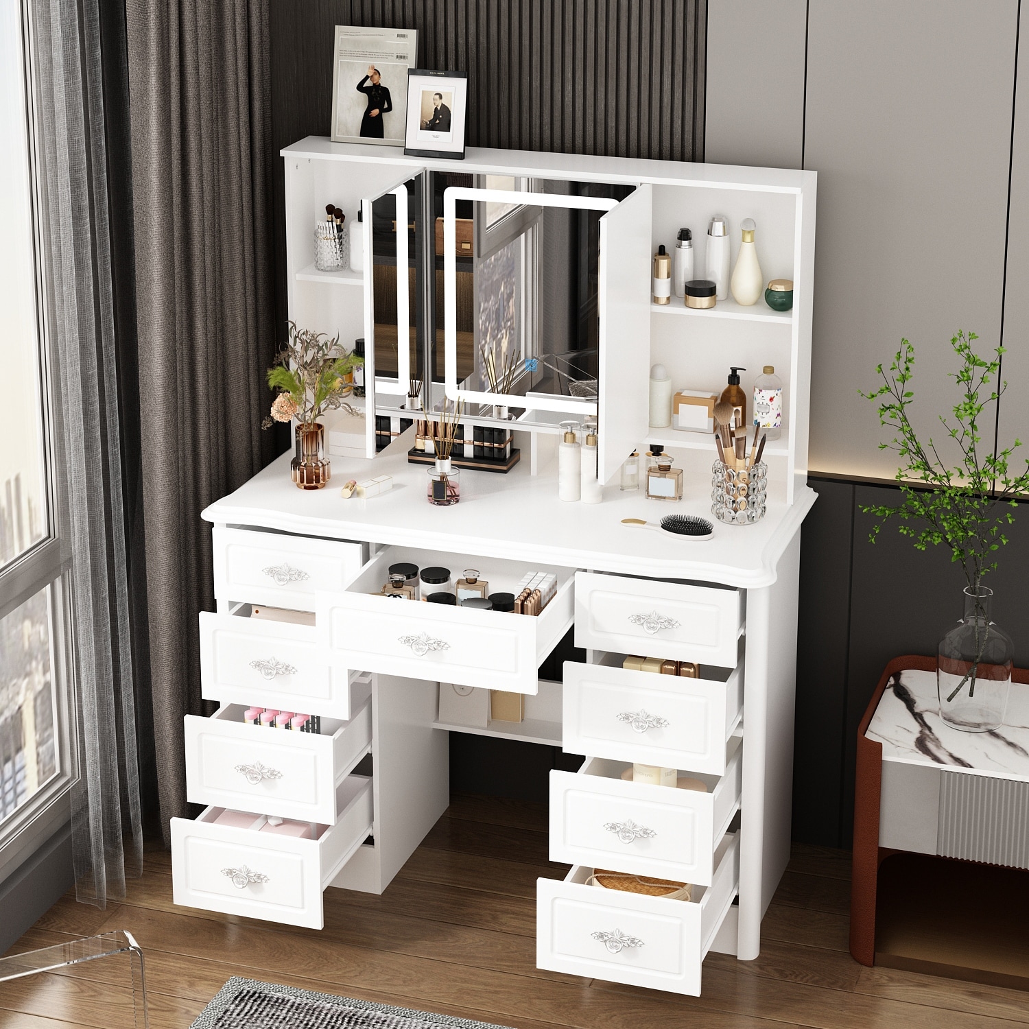 White Makeup Vanity Desk with LED Mirror, 9-Drawer Vanity Table with Storage Cabinets for Bedroom