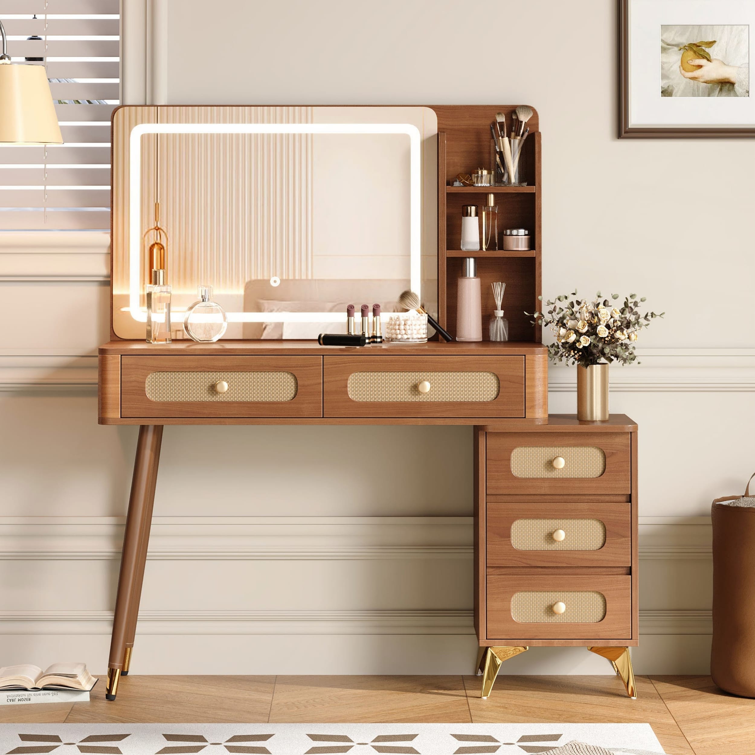 47in Vintage Makeup Vanity with Mirror, Lights, 5 Drawers, and Rattan Design for Elegant and Functional Beauty Space
