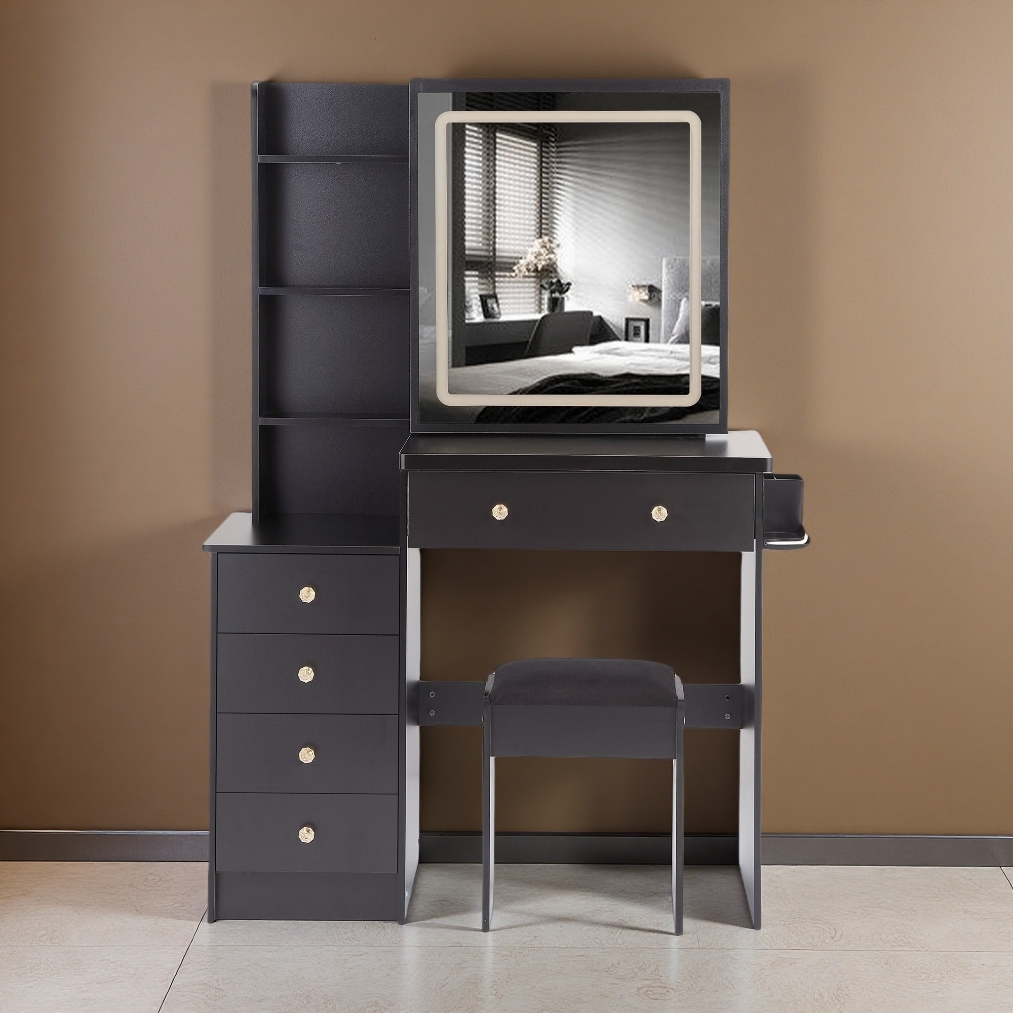37" Middle Size Left Bedside Cabinet Vanity Table +Cushioned Stool,Extra Large Sliding Mirror,Multi Layer High Capacity Storage