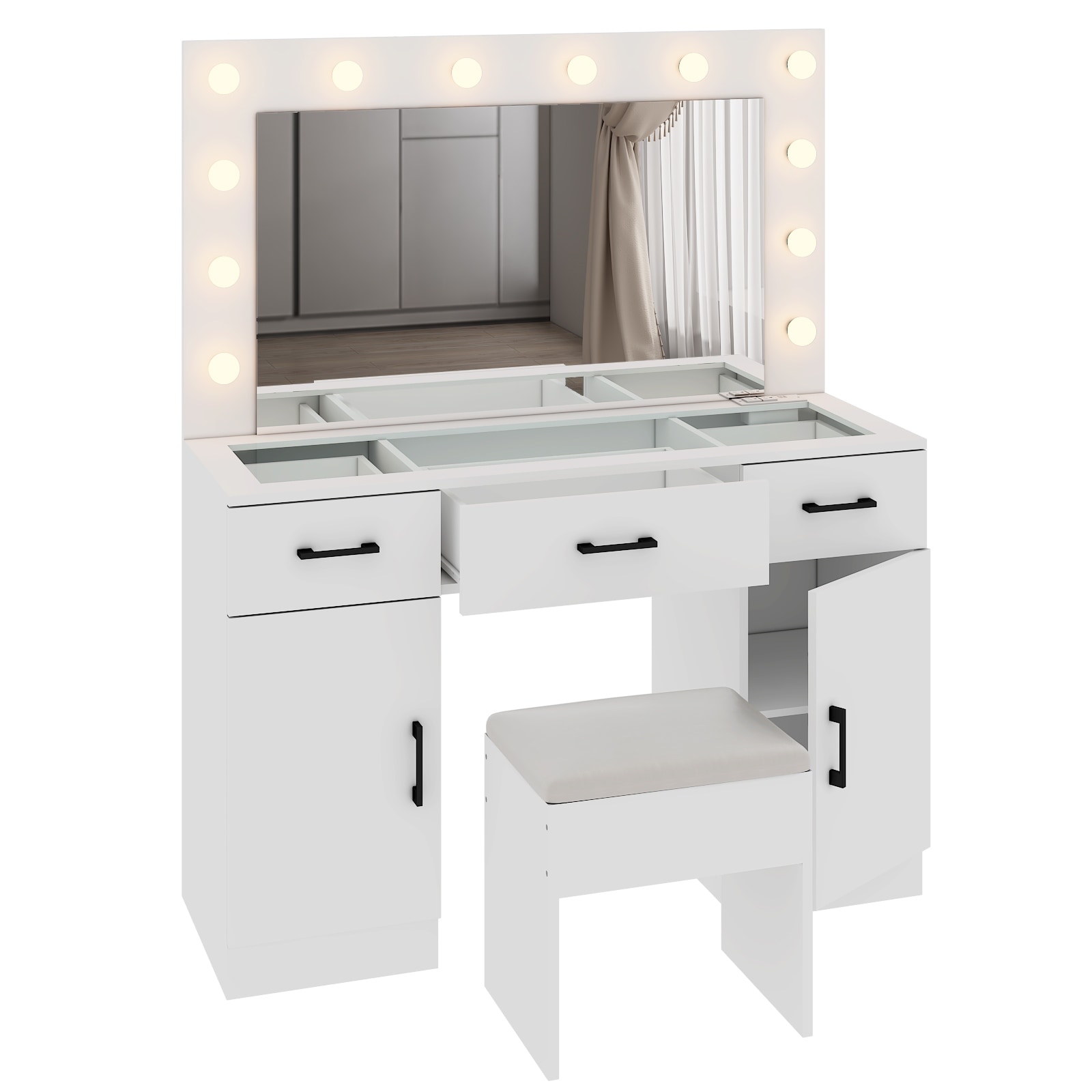 Modern Makeup Vanity Desk with Mirror and Lights, Retractable Dressing Table with Drawers and Cabinet, with Power Outlet
