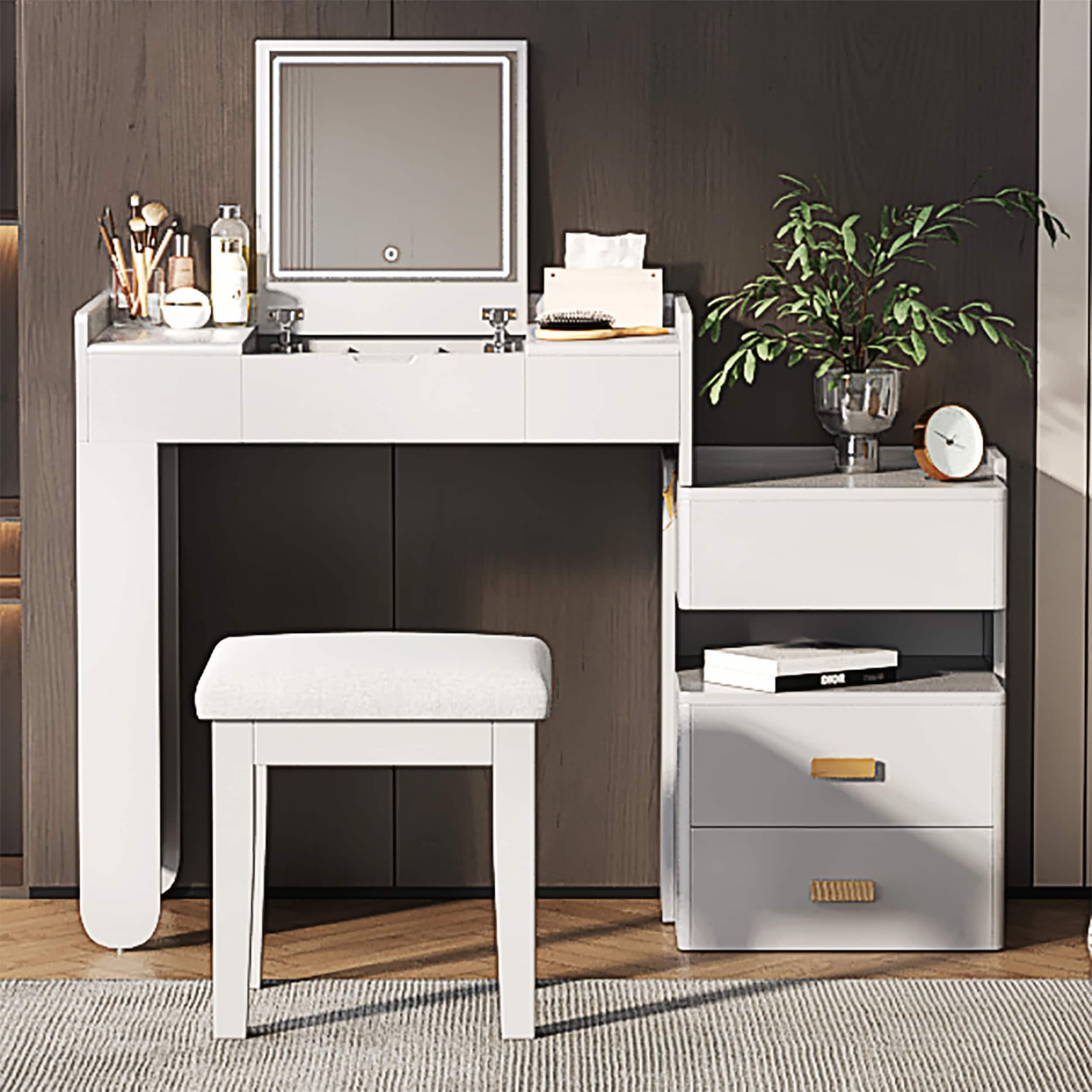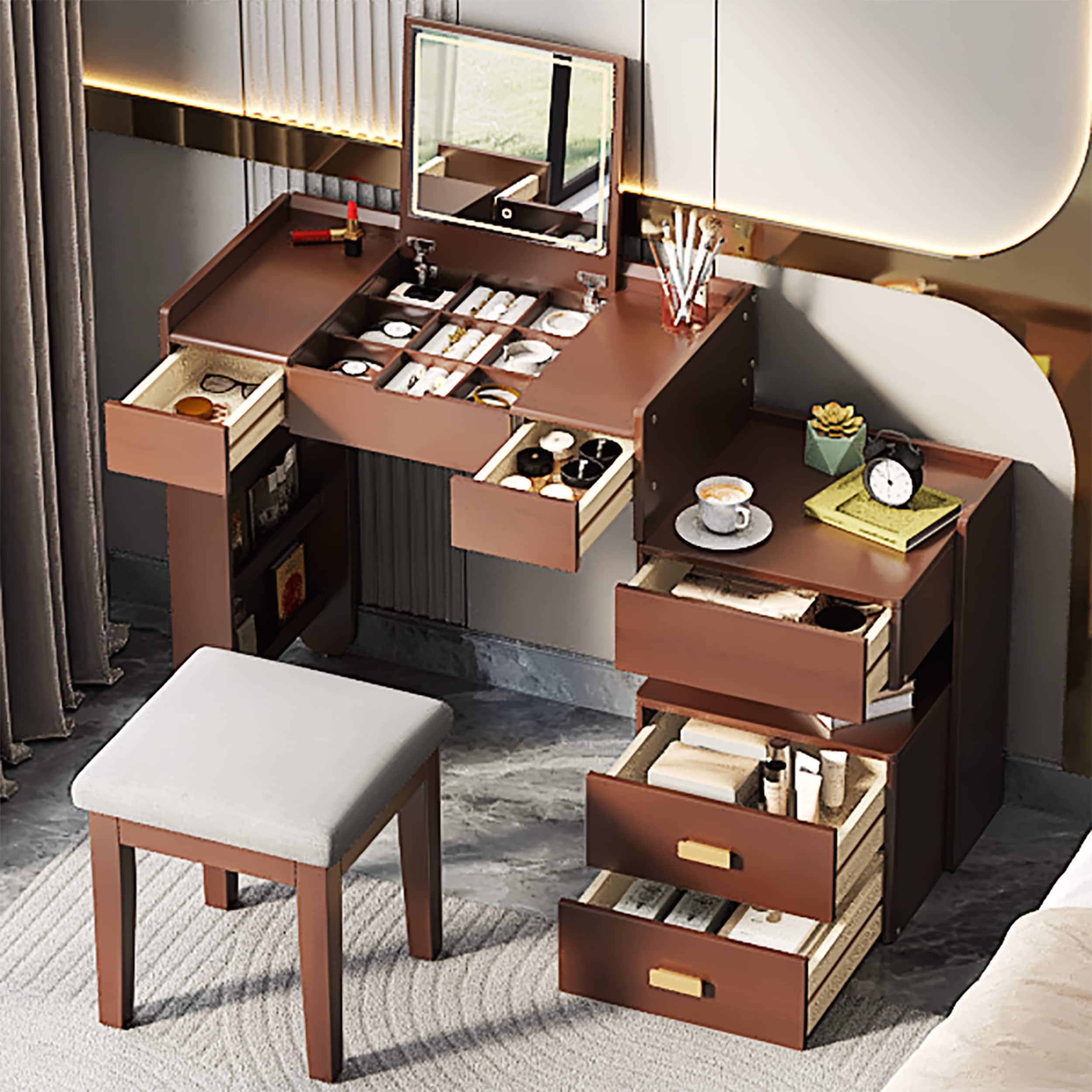 37" Middle Size Left Bedside Cabinet Vanity Table + Cushioned Stool, Extra Large Right sliding mirror, Multi Layer High Capacity