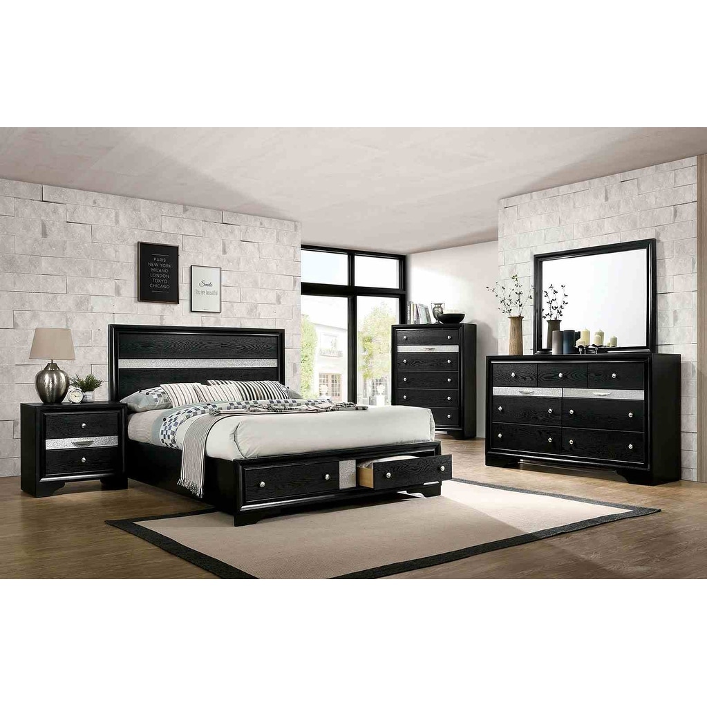 Contemporary Black Bedroom Set Bed Dresser Mirror Nightstand Chest with Silver Accents