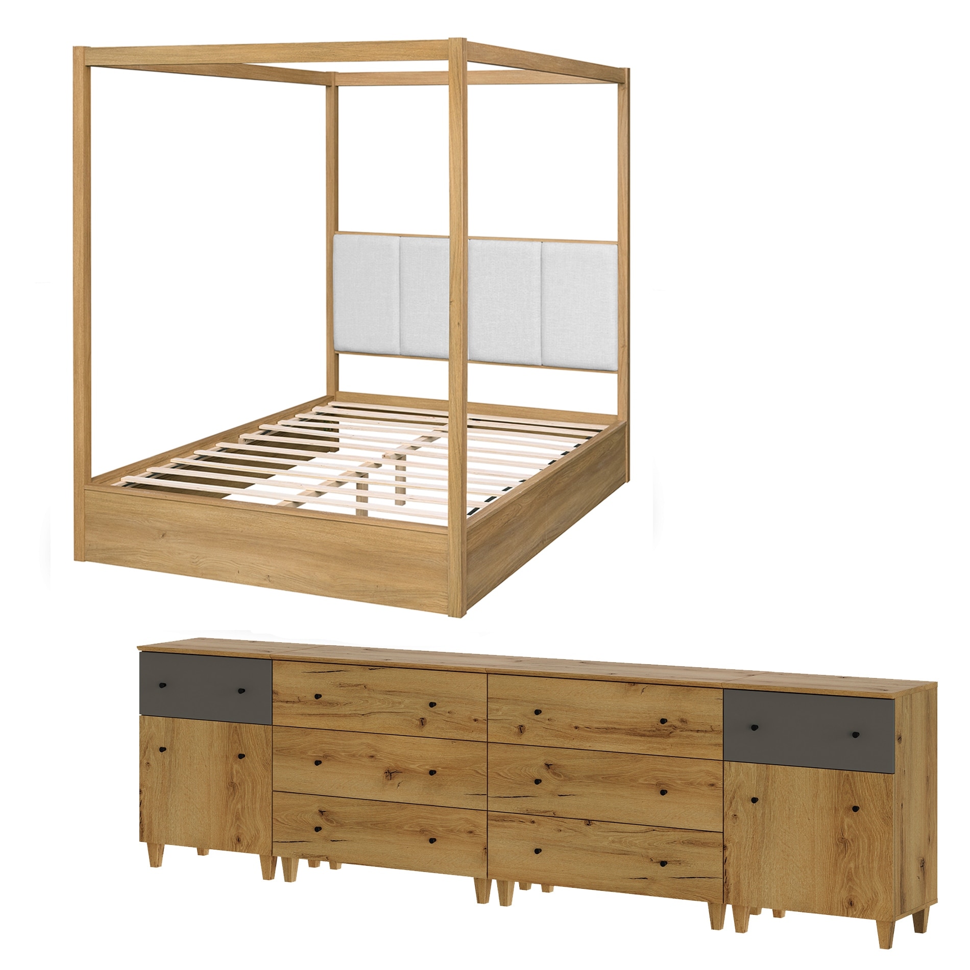 WAMPAT Modern Wooden Bedroom Furniture Set, Queen Canopy Bed Frame, 3-in-1 Dresser with 2 Cabinets and 5 Drawers