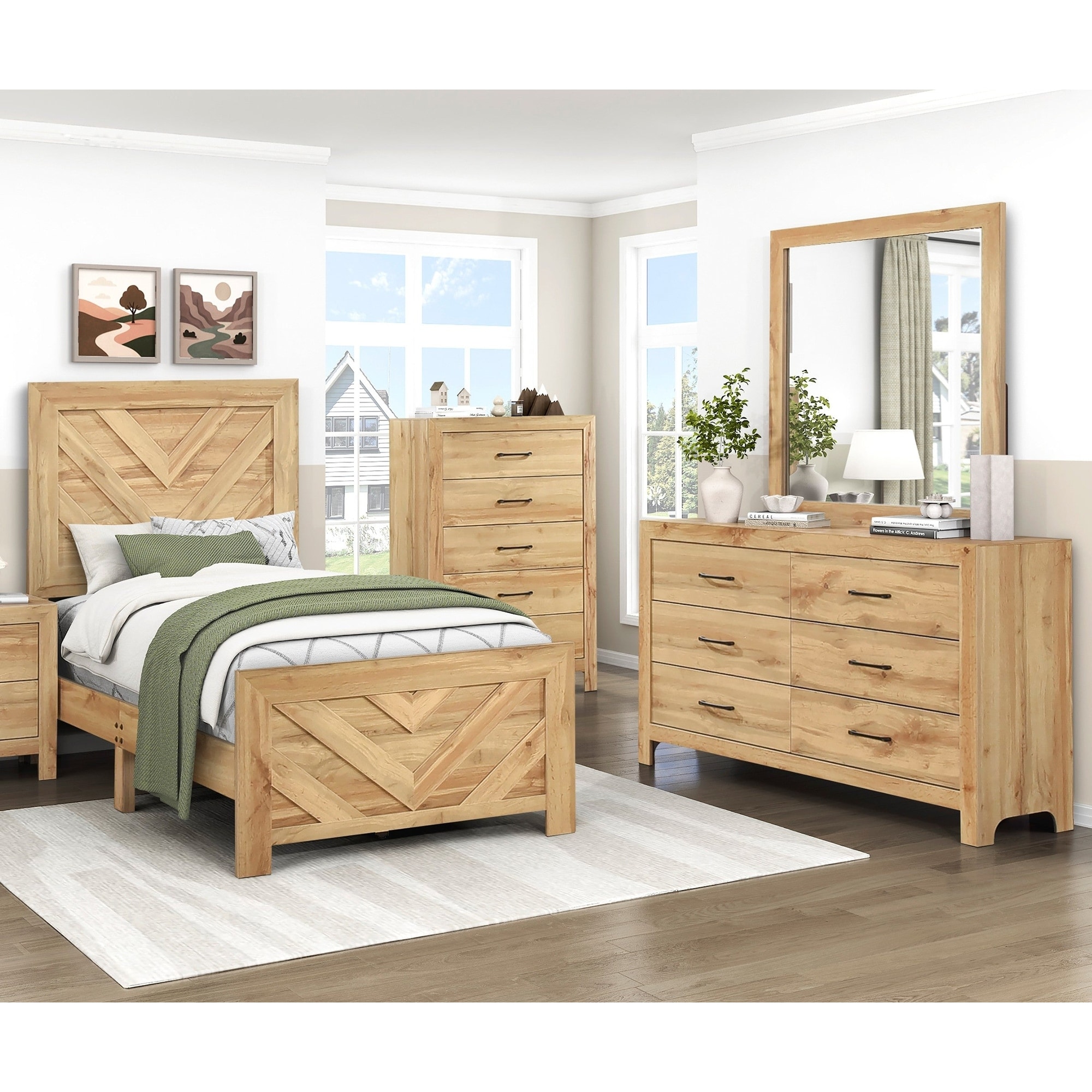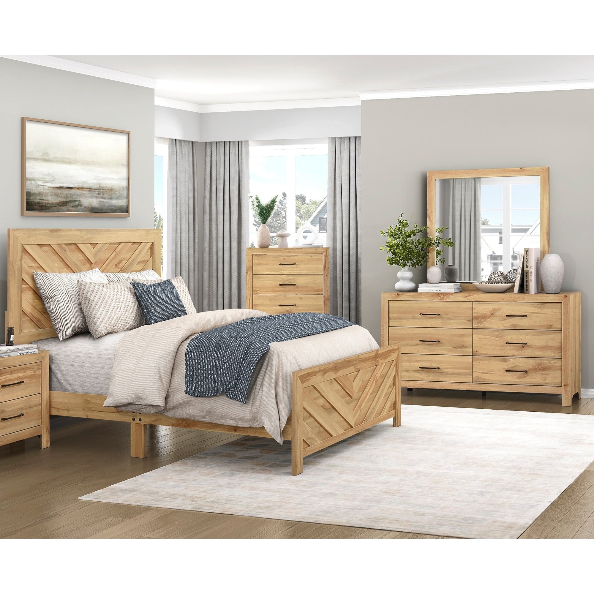 4pc Bedroom Set Chevron Pattern Natural Finish Bed Dresser Mirror Chest