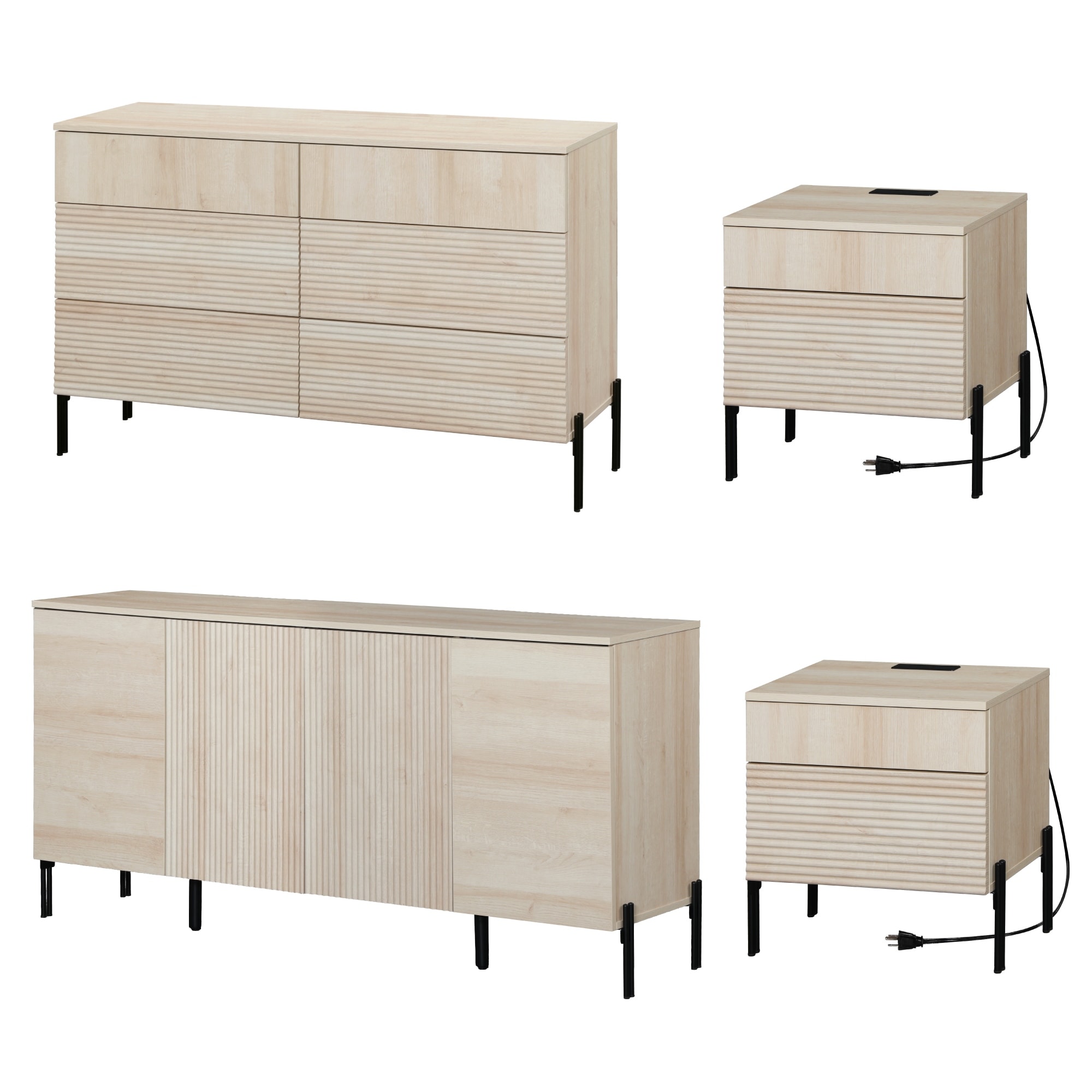 WAMPAT 4-Piece Bedroom Furniture Set, 47" Fluted 6 Drawer Dresser, 61" Buffet Sideboard, 2 Nightstand with Charging Station, Oak