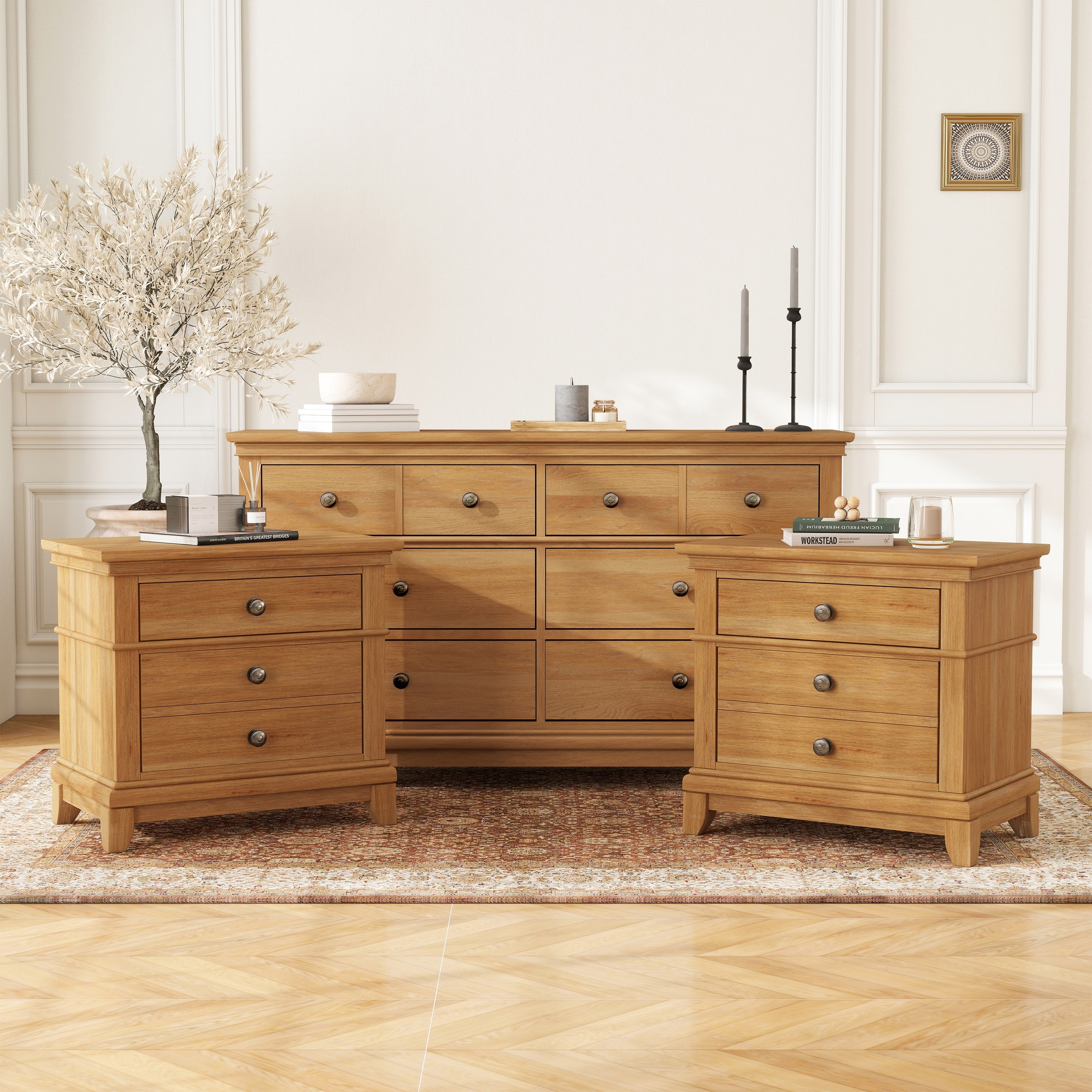 Furniture of America Wellington Farmhouse 3-Piece Natural Oak Wood Dresser and 2-Nightstand Bedroom Set