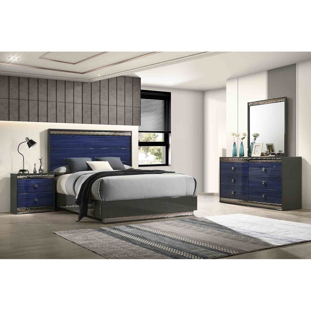 Glam Ash Gray and Indigo Blue Finish 4pc Bedroom Set Bed Nightstand Mirror Dresser
