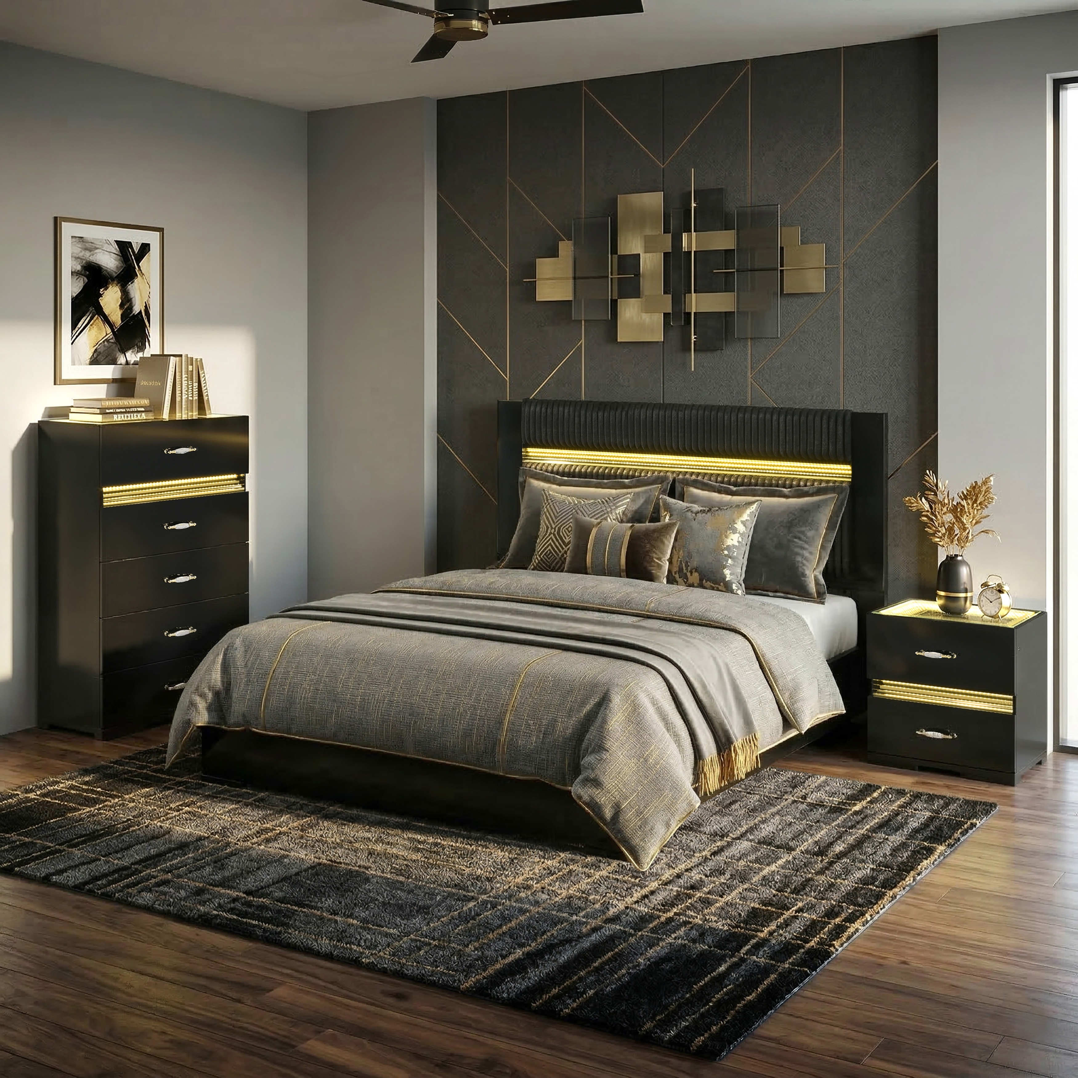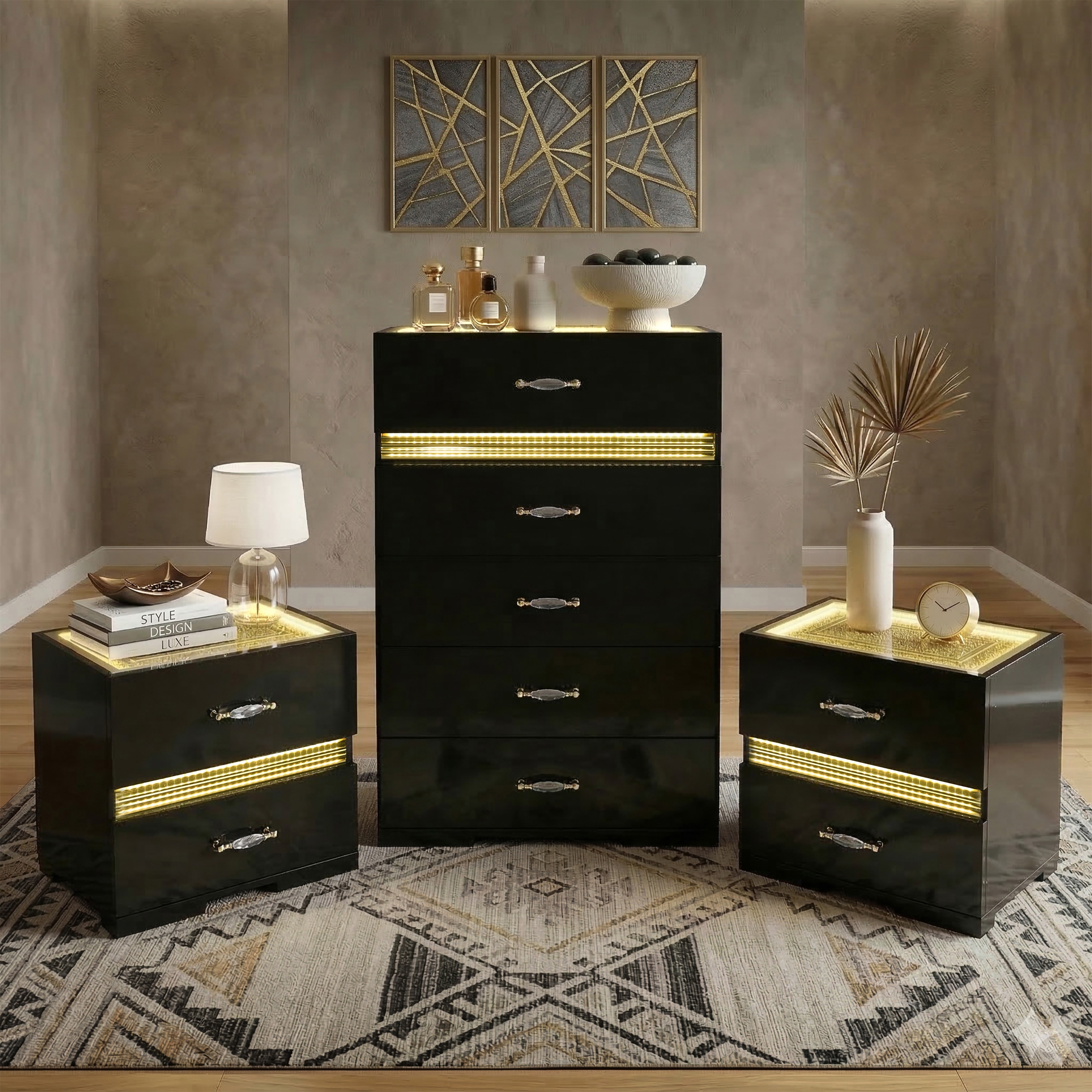 Furniture of America Saven Modern 3-Piece Black Solid Wood Chest and 2 Nightstand Bedroom Set with LED Light