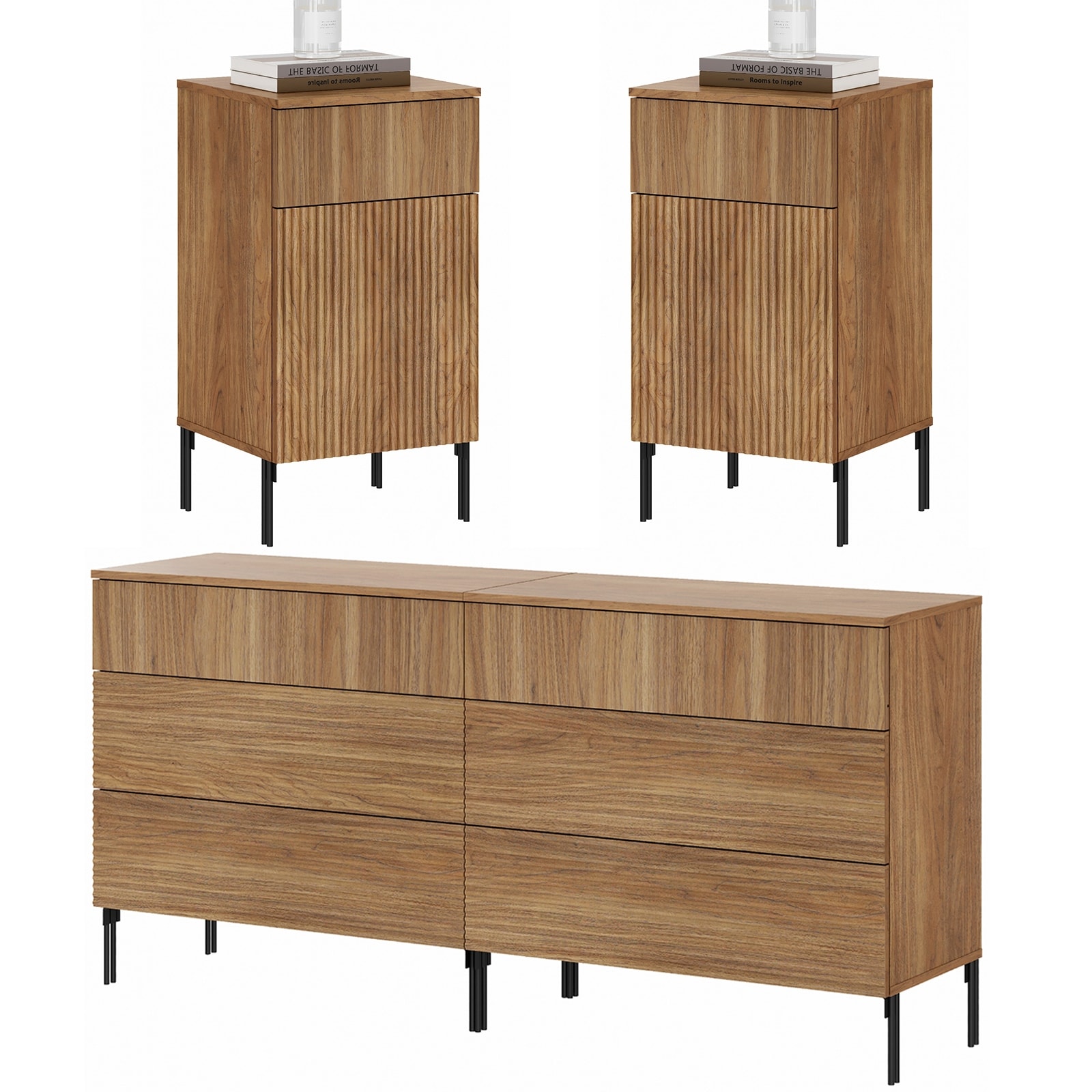 4 Pcs Bedroom Set,Reeded 6 Drawer Dresser and Nightstand Sets for Bedroom, Night Stand Set of 2