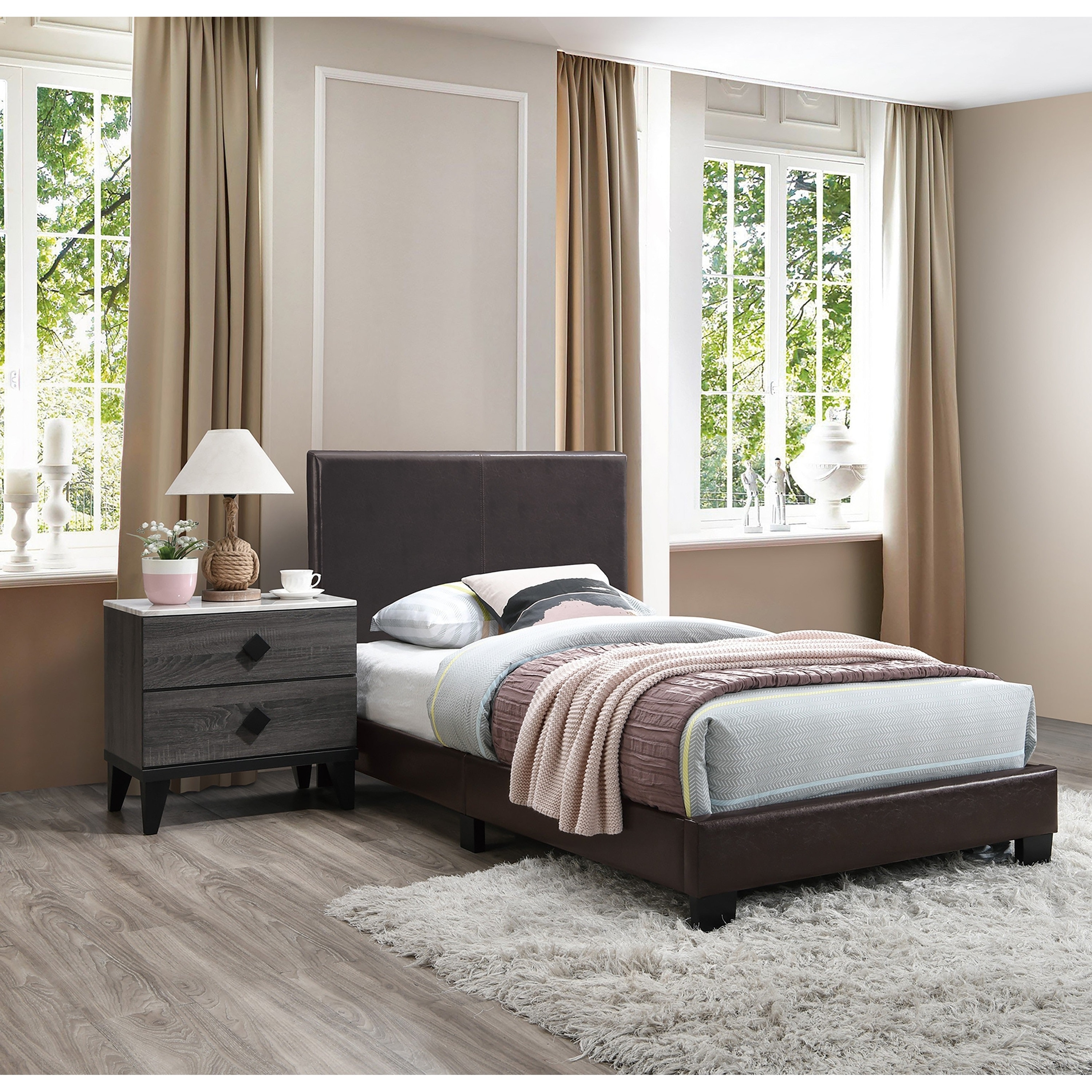 3pc Set Bed 2x Nightstand Tapered Legs Transitional Brown Finish