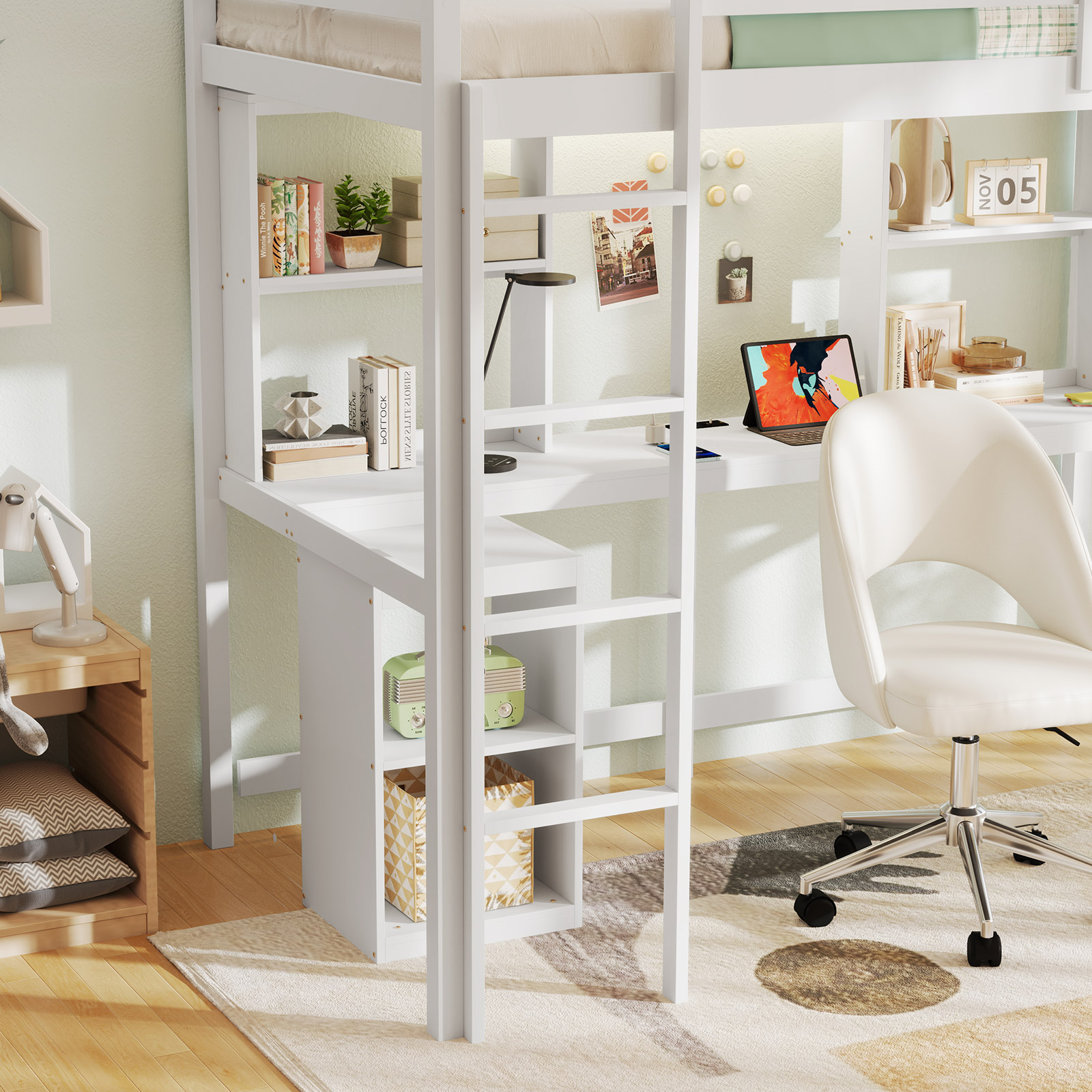 Twin Size Loft Bed With Desk & Shelves Space Saving White Wooden Loft Bed For Home, Dorm, Apartment Twin Size Loft Bed With Desk & Shelves Space Saving White Wooden Loft Bed For Home, Dorm, Apartment