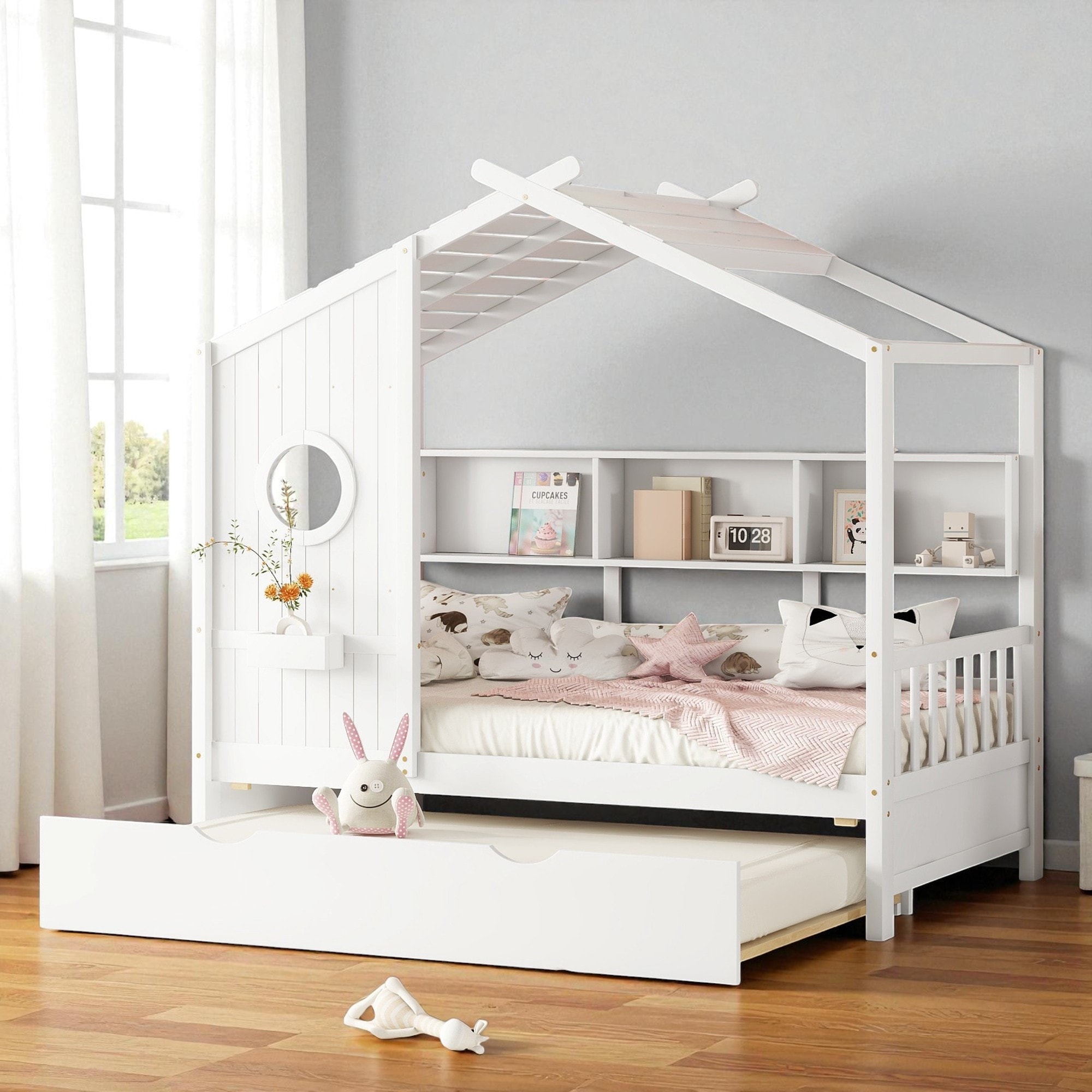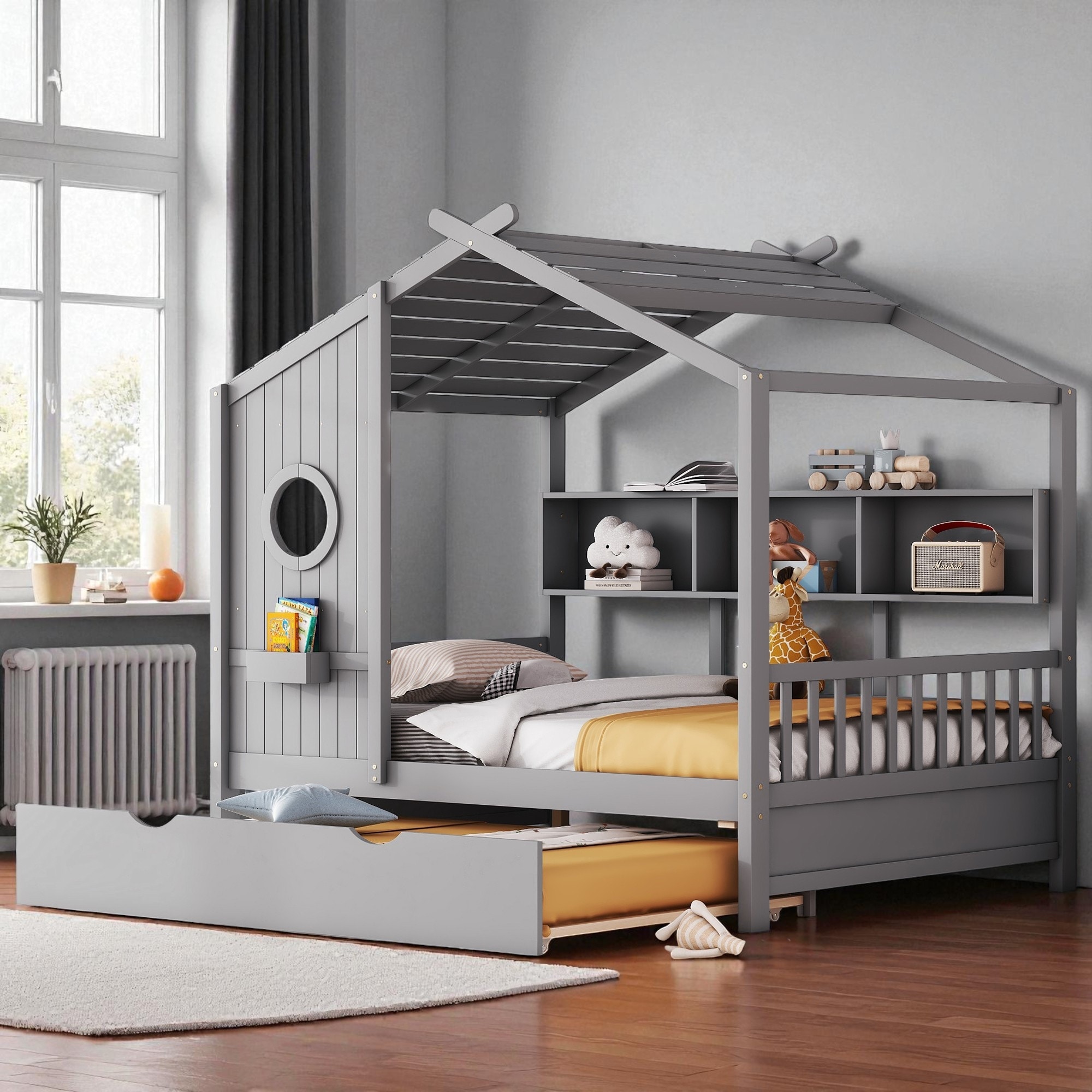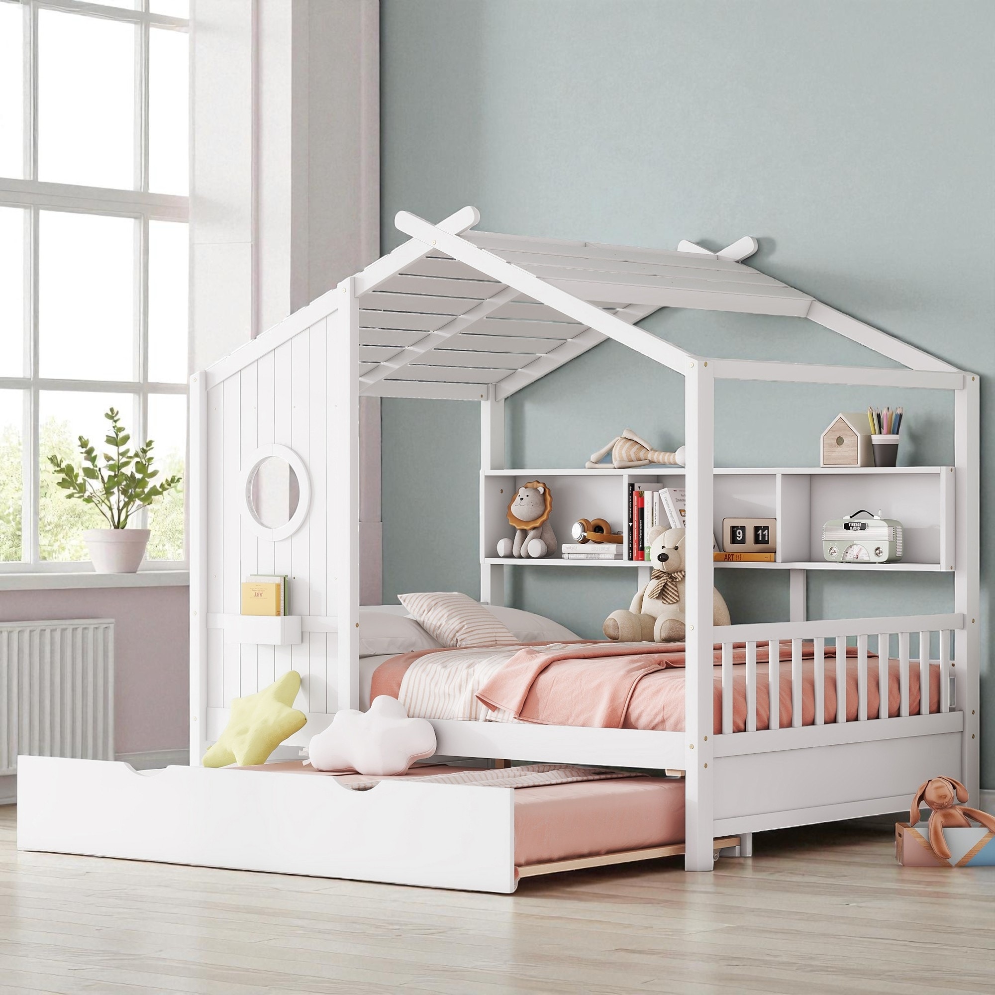 Wooden Twin/Full Size House Bed with Trundle and Storage Shelf, Kids Bed Frame with Roof Design and Playhouse Style
