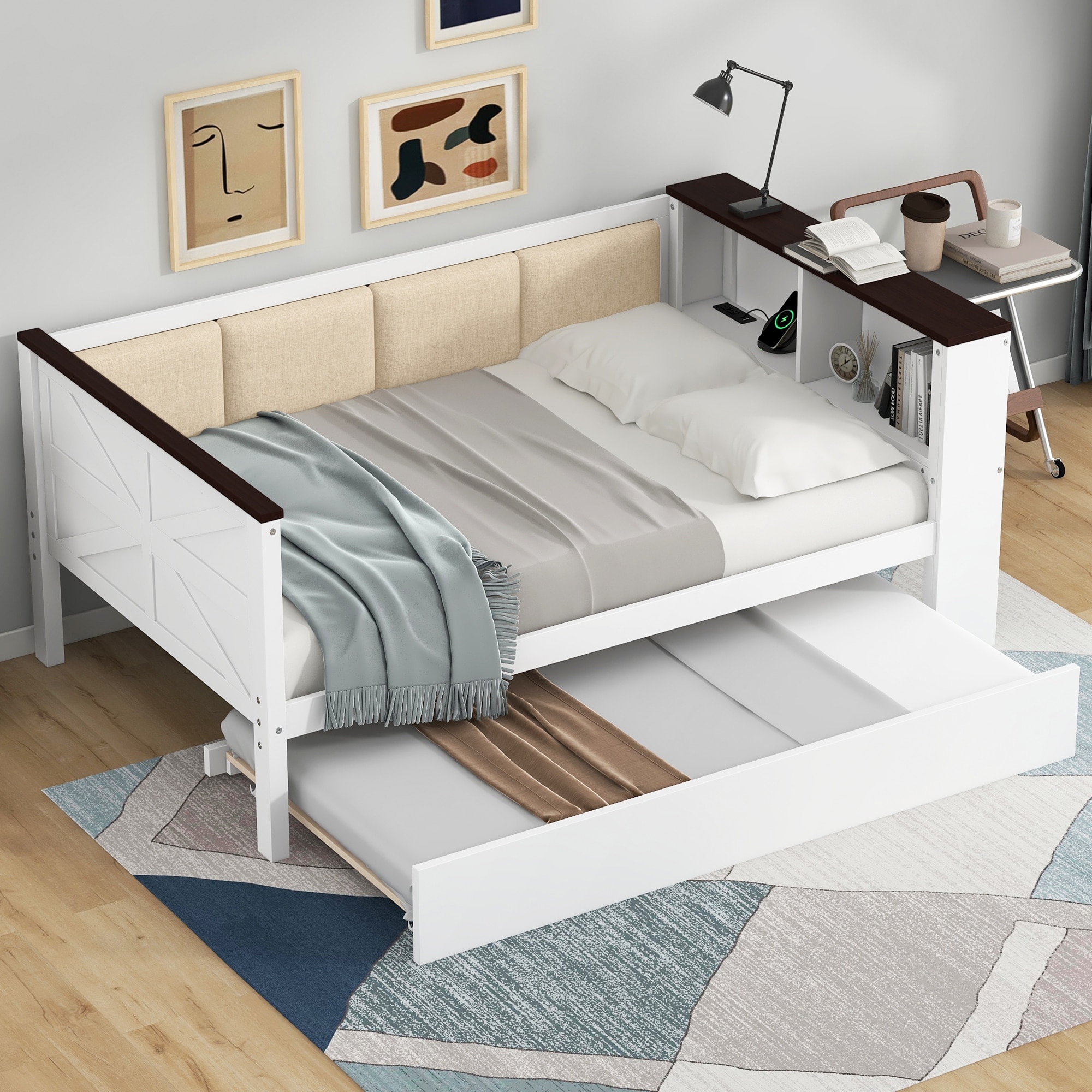Twin Size Upholstery Daybed with Trundle Bed and Two Storage Drawers