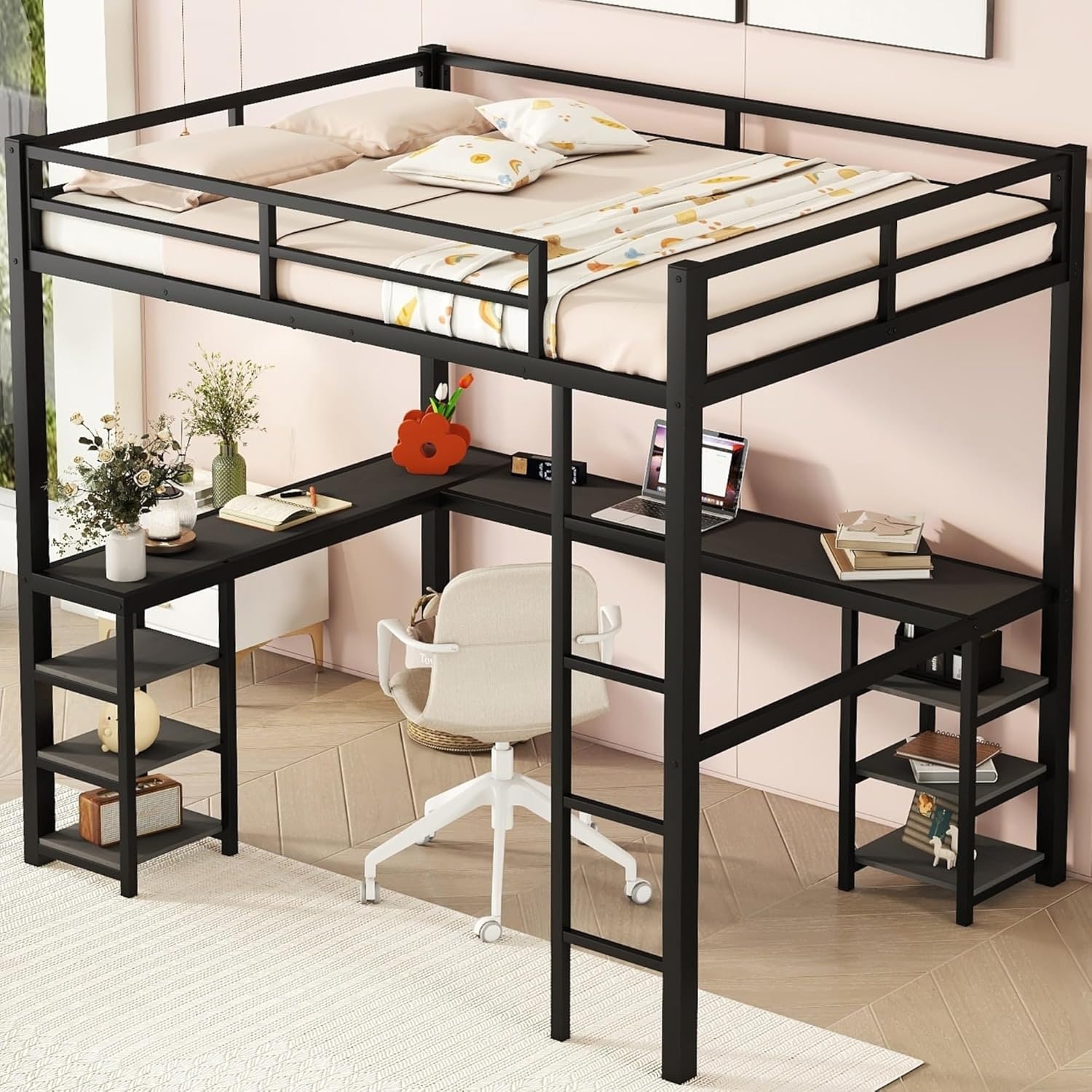 Full Size Loft Bed with L-Shaped Desk, Storage Shelves, and Ladder, Heavy Duty Metal Frame, Ideal for Kids and Teens