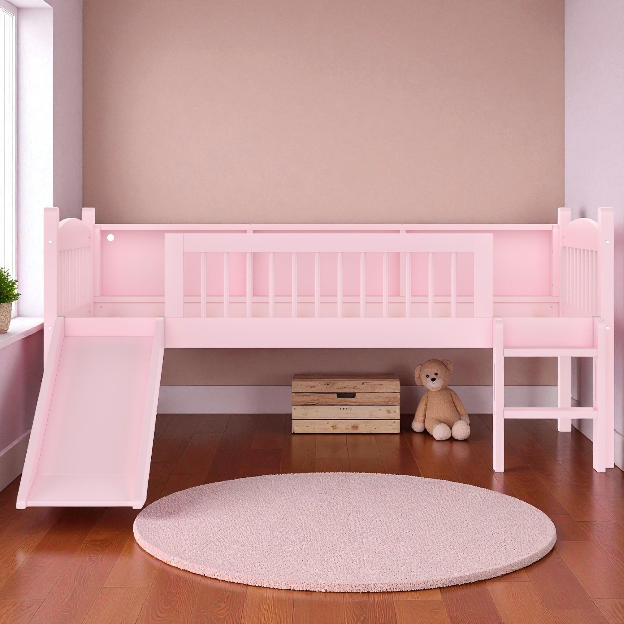 Twin size Rubber Wood Loft Bed with Ladder, 13 Strengthened Slats and Safety Guardrails