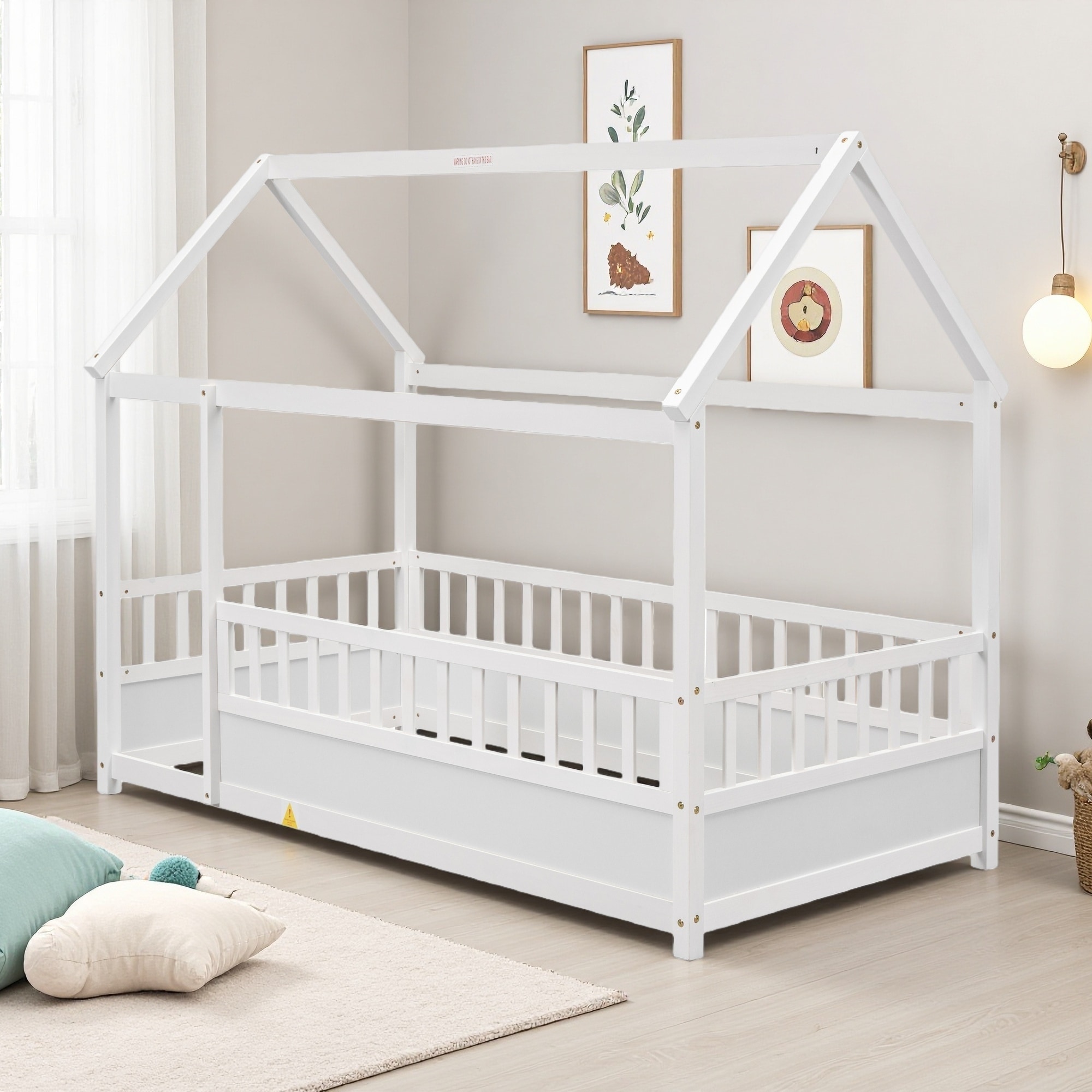 Twin Size Floor House Bed for Toddler, Kids Montessori Bed with Storage Shelf, Playhouse Bed with Roof Design