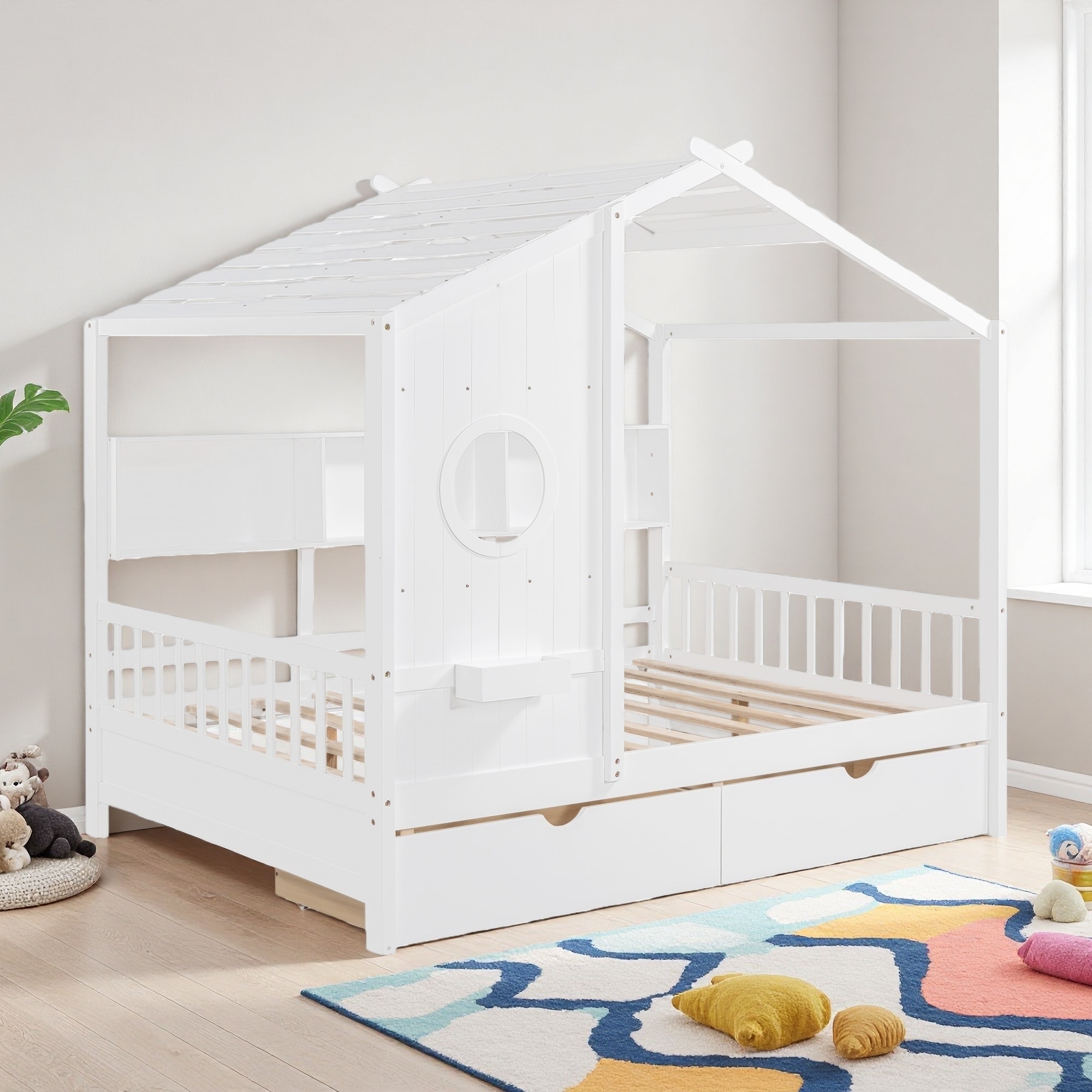 Full Gray Wooden House Bed with Roof & 2 Drawers