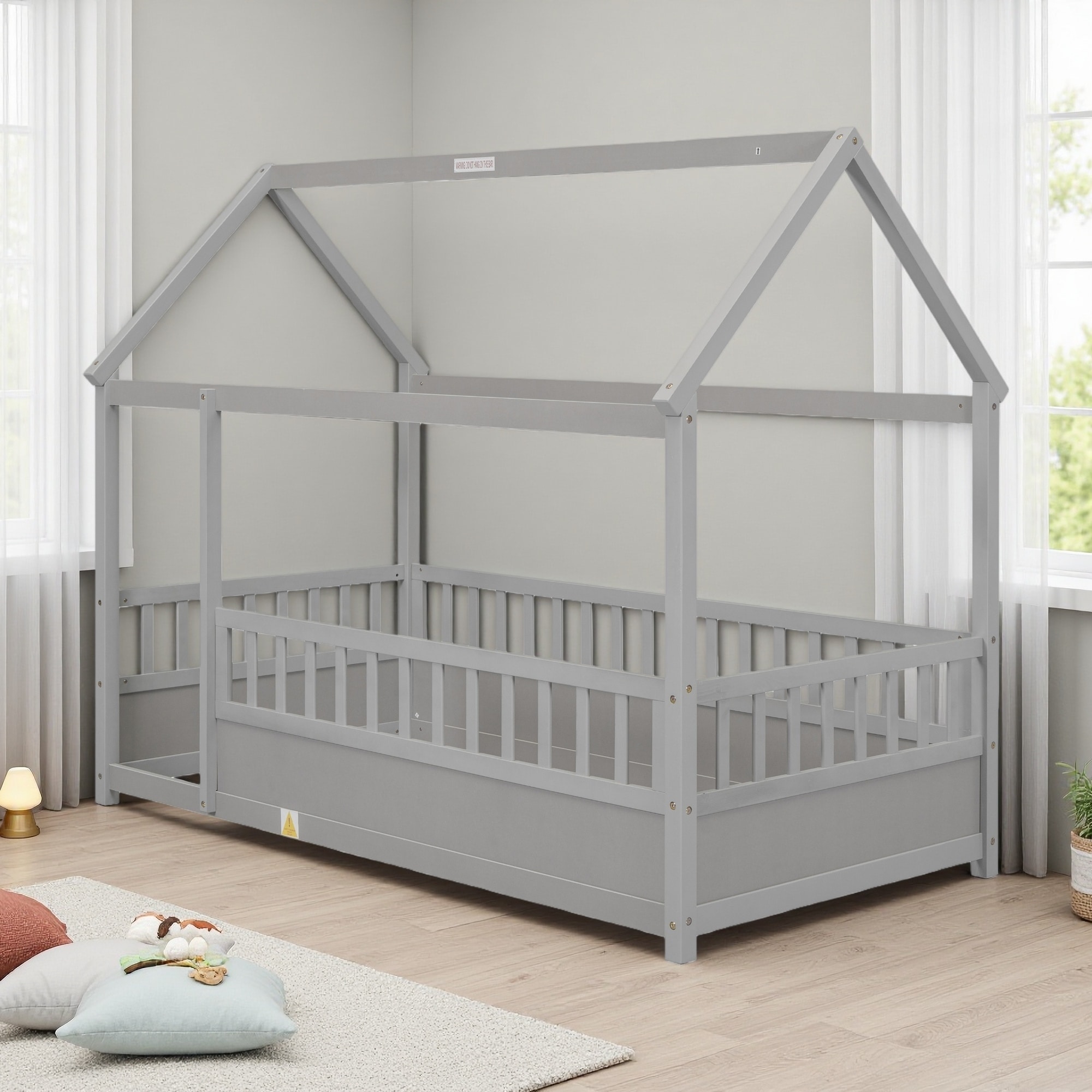 Floor Wooden Bed with House Roof Frame, Fence Guardrails