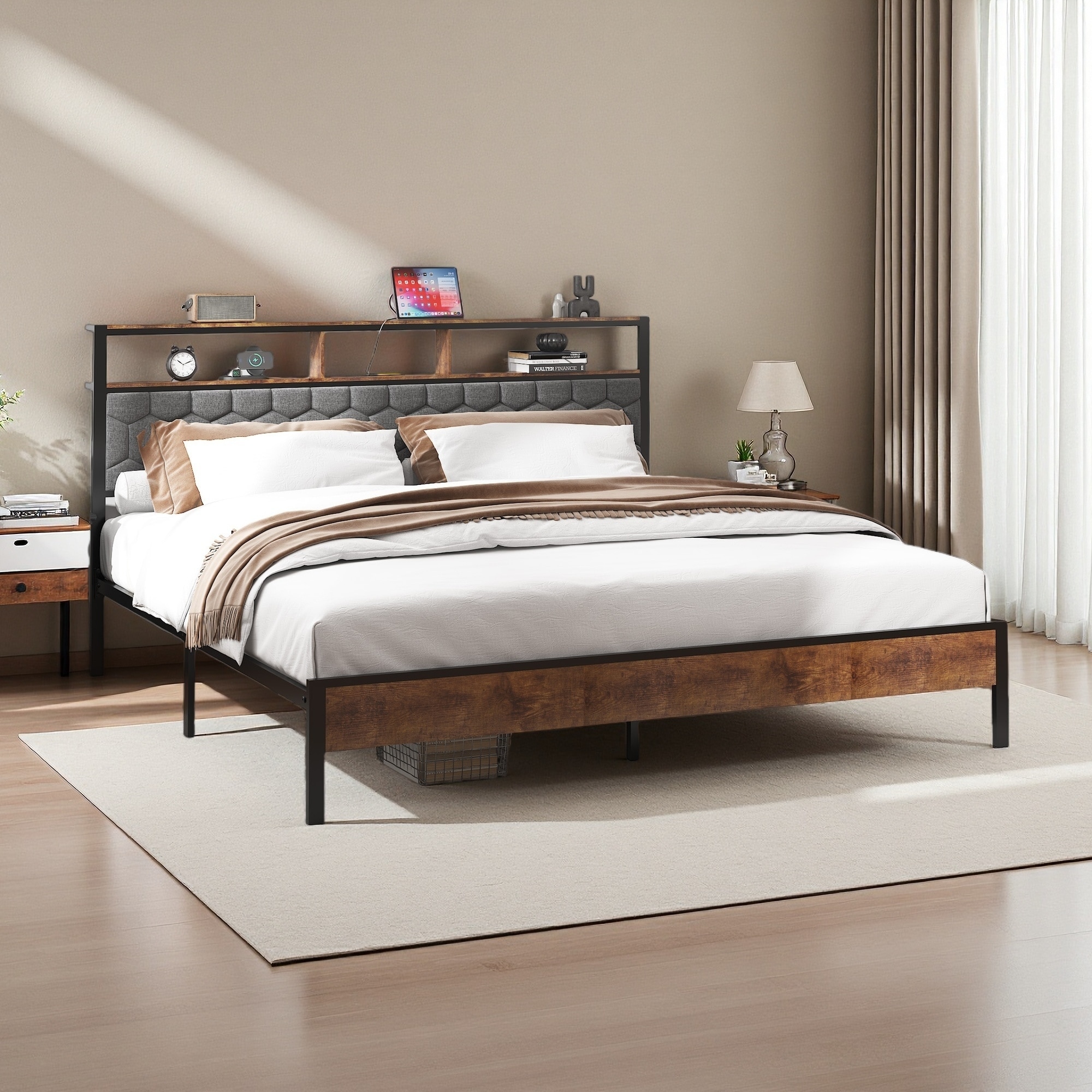 King Size Wooden Platform Bed with Upholstered Headboard & Storage