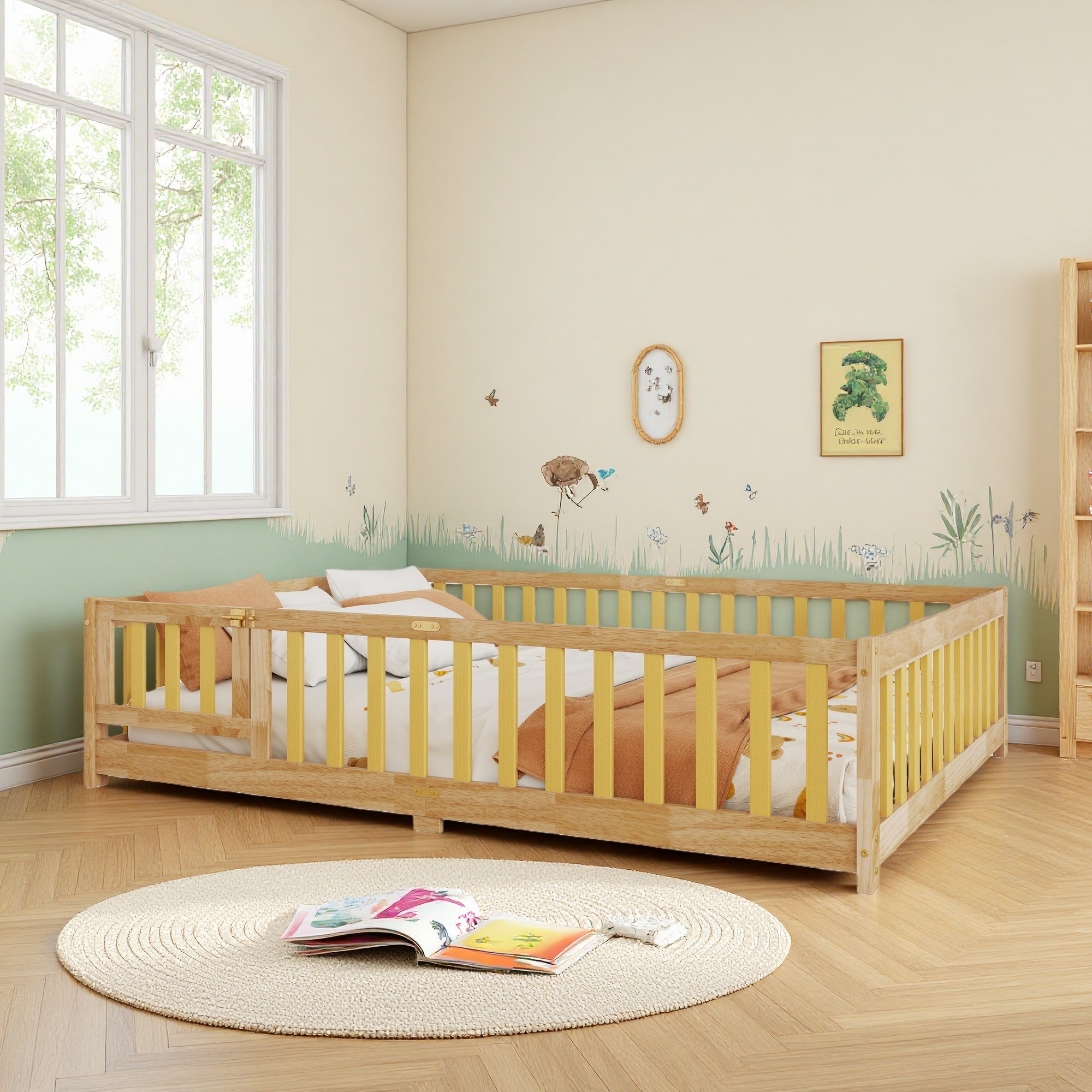 Full Size Floor Bed with Fence & Door, Rubber Wood