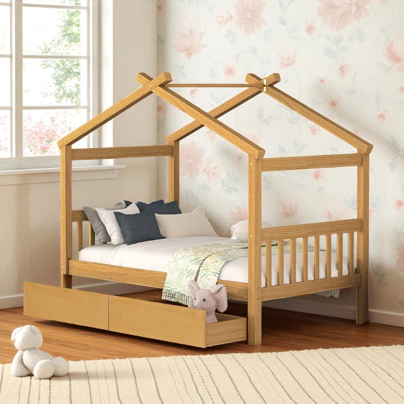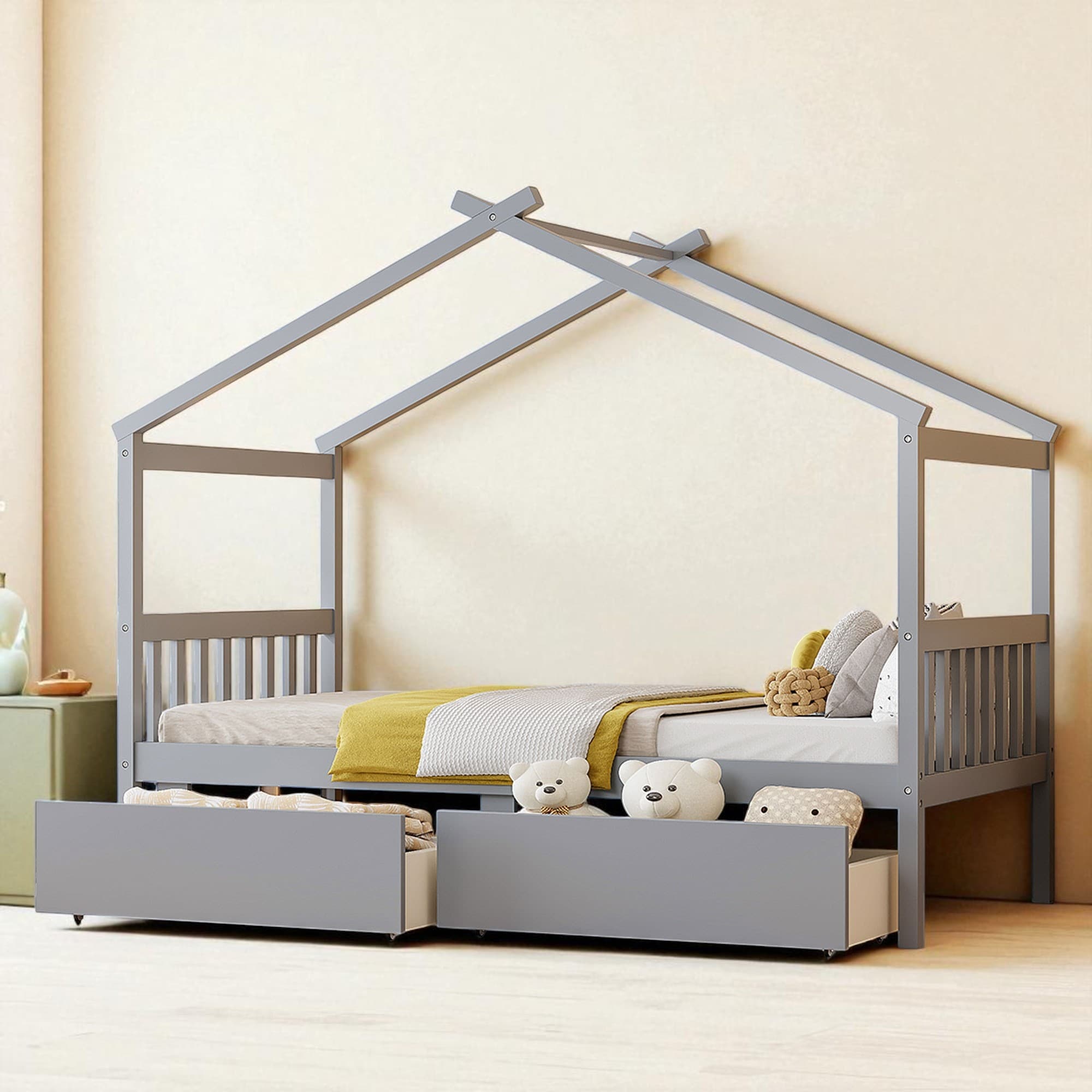 Twin Size Wooden House Bed with Roof and Drawers, Kids Daybed with Storage and Headboards, Pine Wood Frame