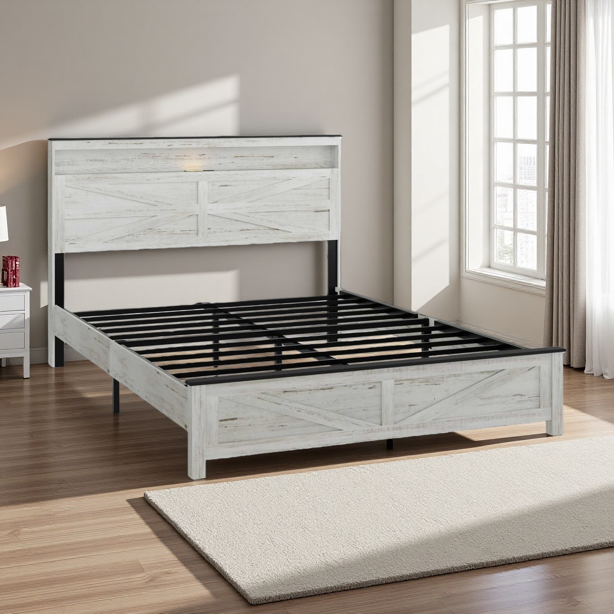 Queen Size Metal & MDF Platform Bed with LED Headboard & Storage