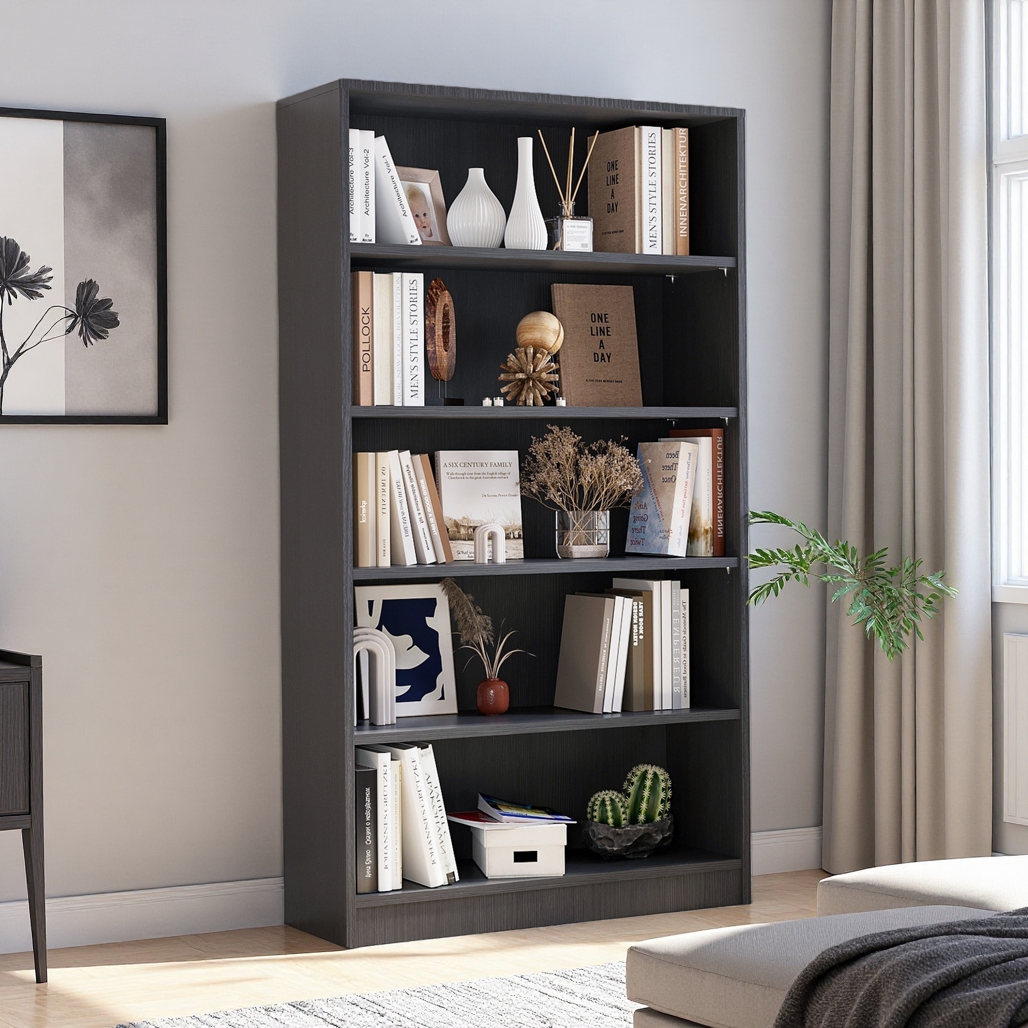 60"H Modern Wood Bookcase, 5-Tier Adjustable Shelf Manga & Bookcase for Bedroom & Living Room with Tip-Over Resistance