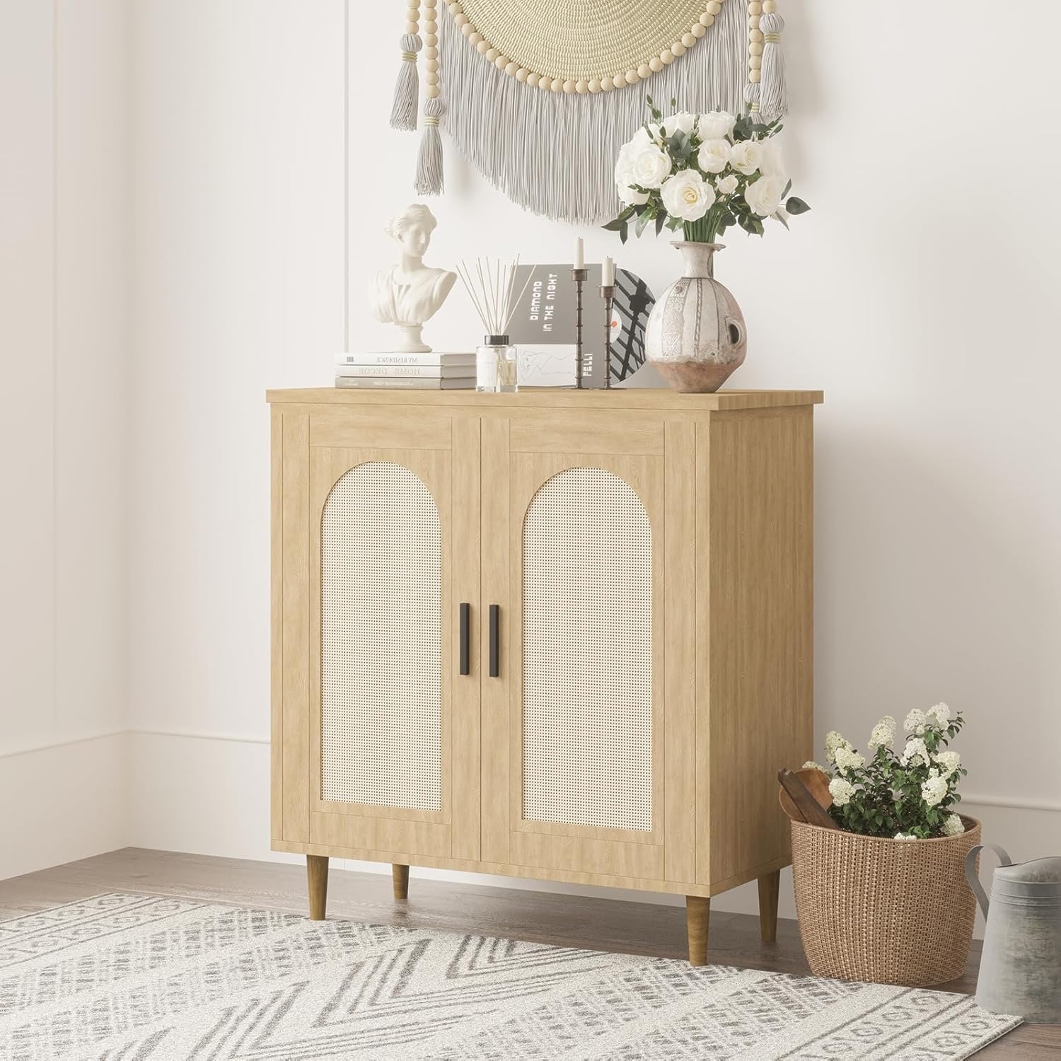 Sideboard Buffet Kitchen Cabinet with Rattan & Wood Feet for Living Room Hallway Entryway