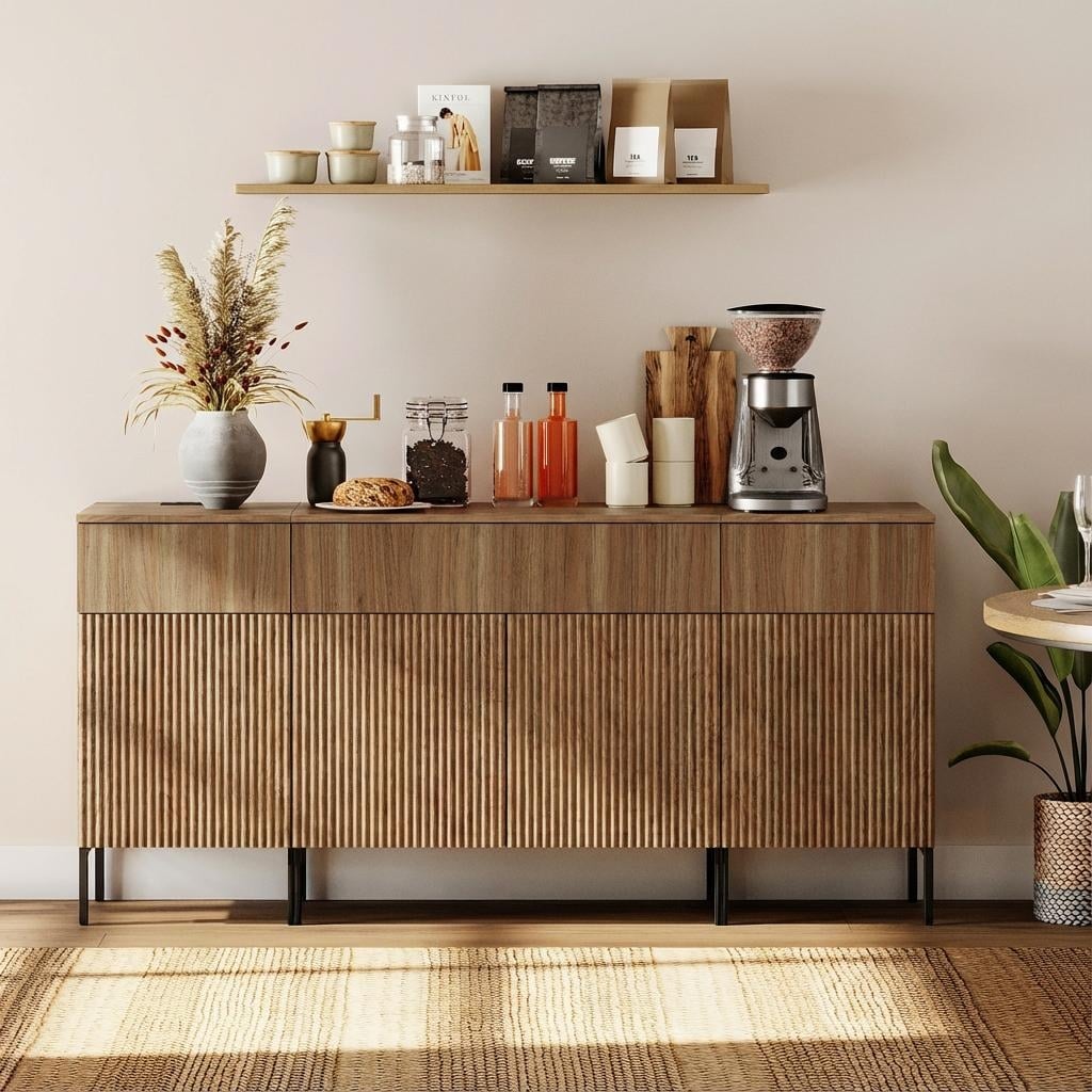 63" Wooden Reeded Sideboard With Doors And Drawers, 3-In-1 Modern Credenza With Charging
