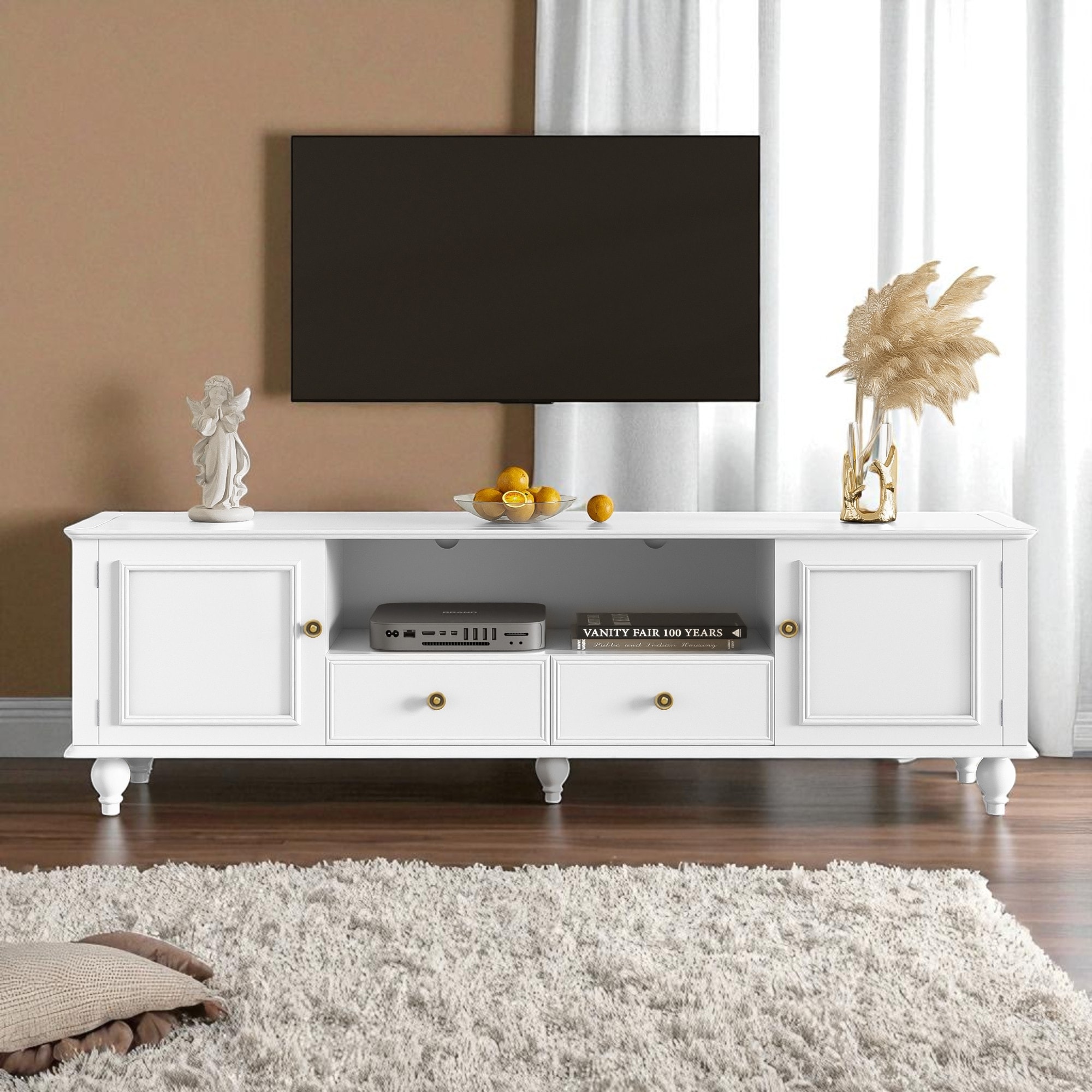 70.9'' Modern TV Stand for TVs up to 80", Entertainment Center with Cabinets, Drawers, Open Compartment and Solid Wood Legs