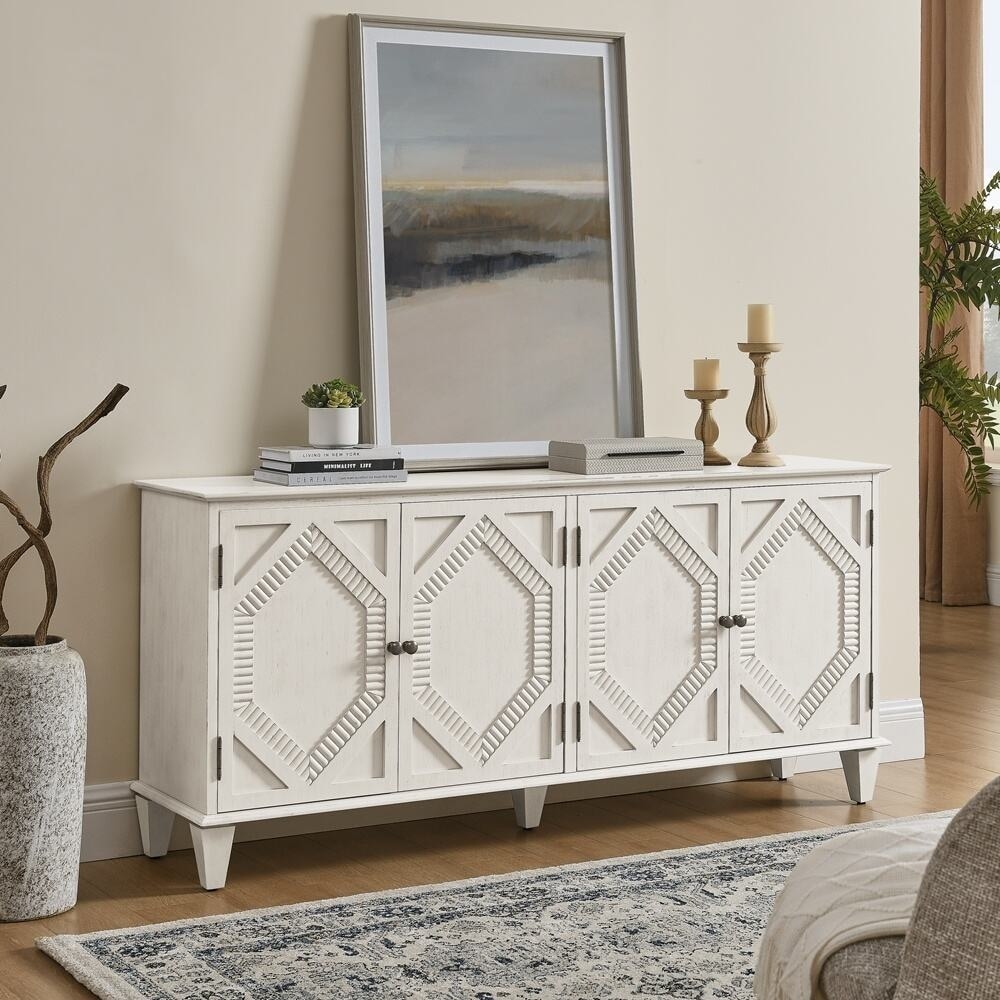 60 Inch White Accent Cabinet with 4 Doors, Rustic Wood Sideboard for Home Decor and Organization, Versatile Storage Solution