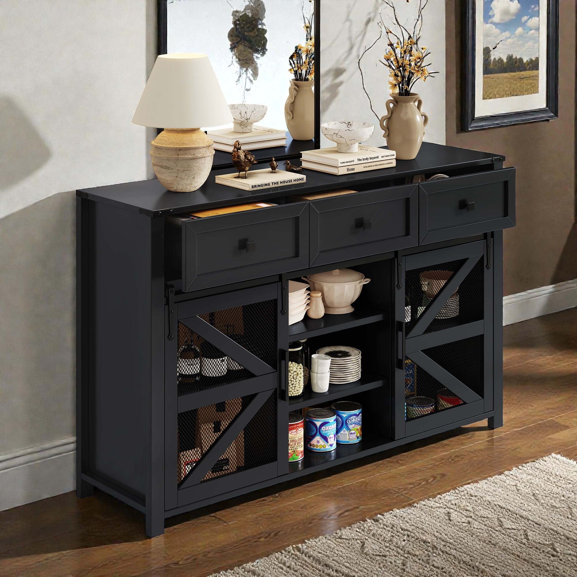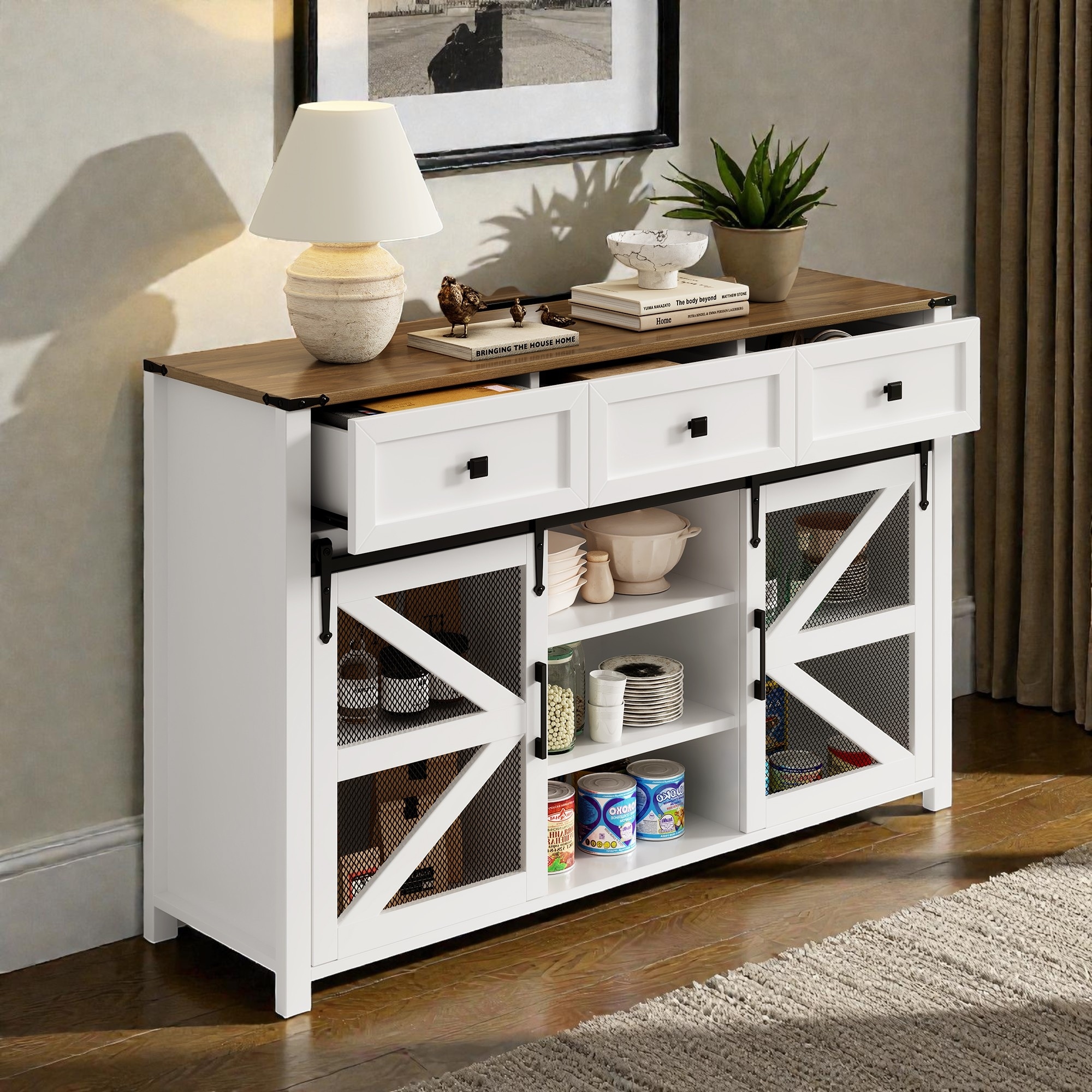 Sliding Barn Door Sideboard with 3 Drawers, Adjustable Shelves, Entryway Cabinet and Industrial Buffet Storage Cabinet