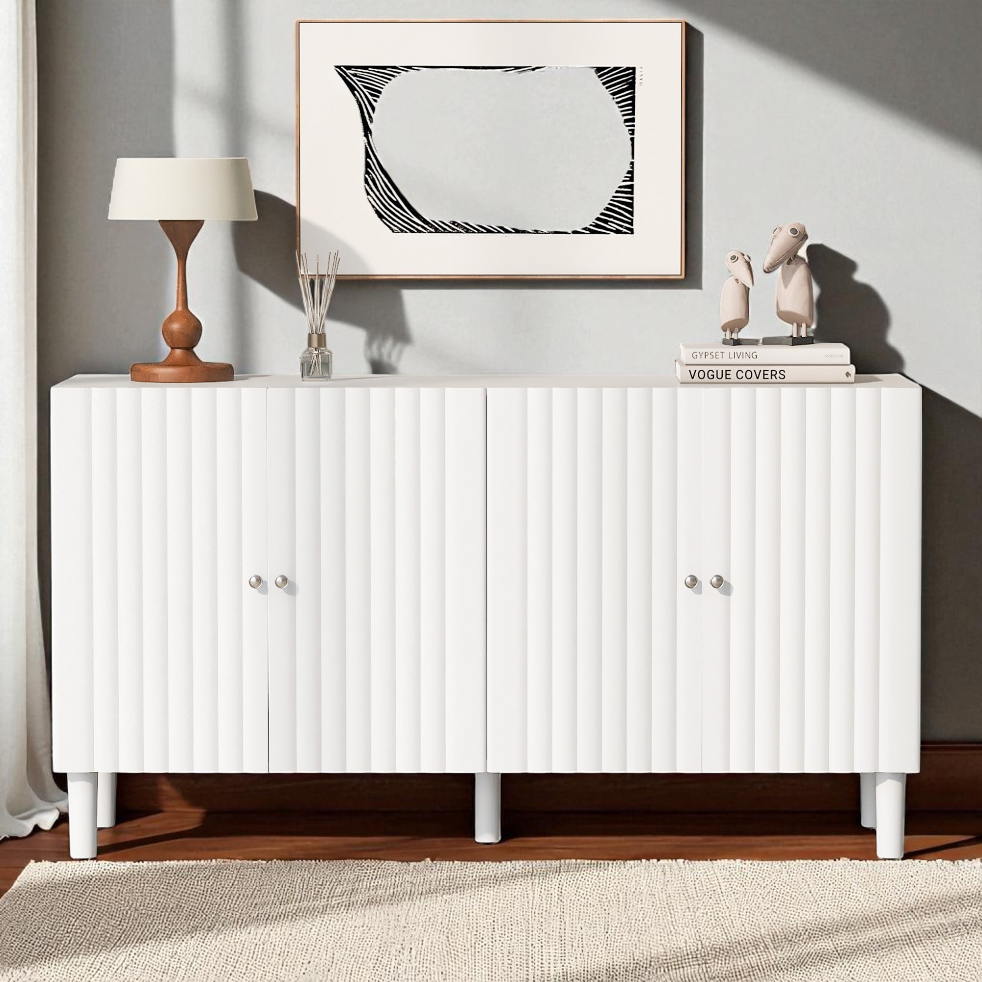 4-Door Sideboard with Wavy Pattern Doors, Cylindrical Rubber Wood Legs, Adjustable Shelves for Kitchen, Dining Room