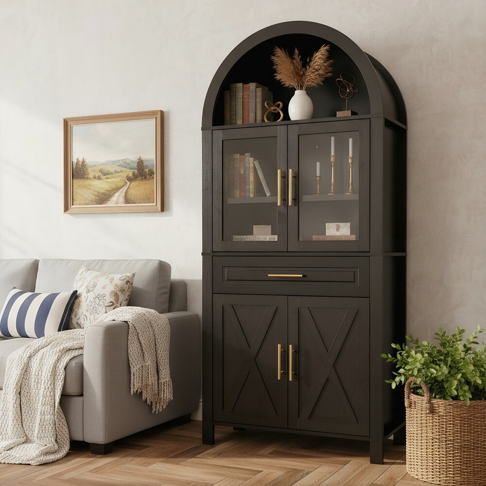 Arched Kitchen Pantry Cabinet with 8 Door Shelves Hidden Drawer