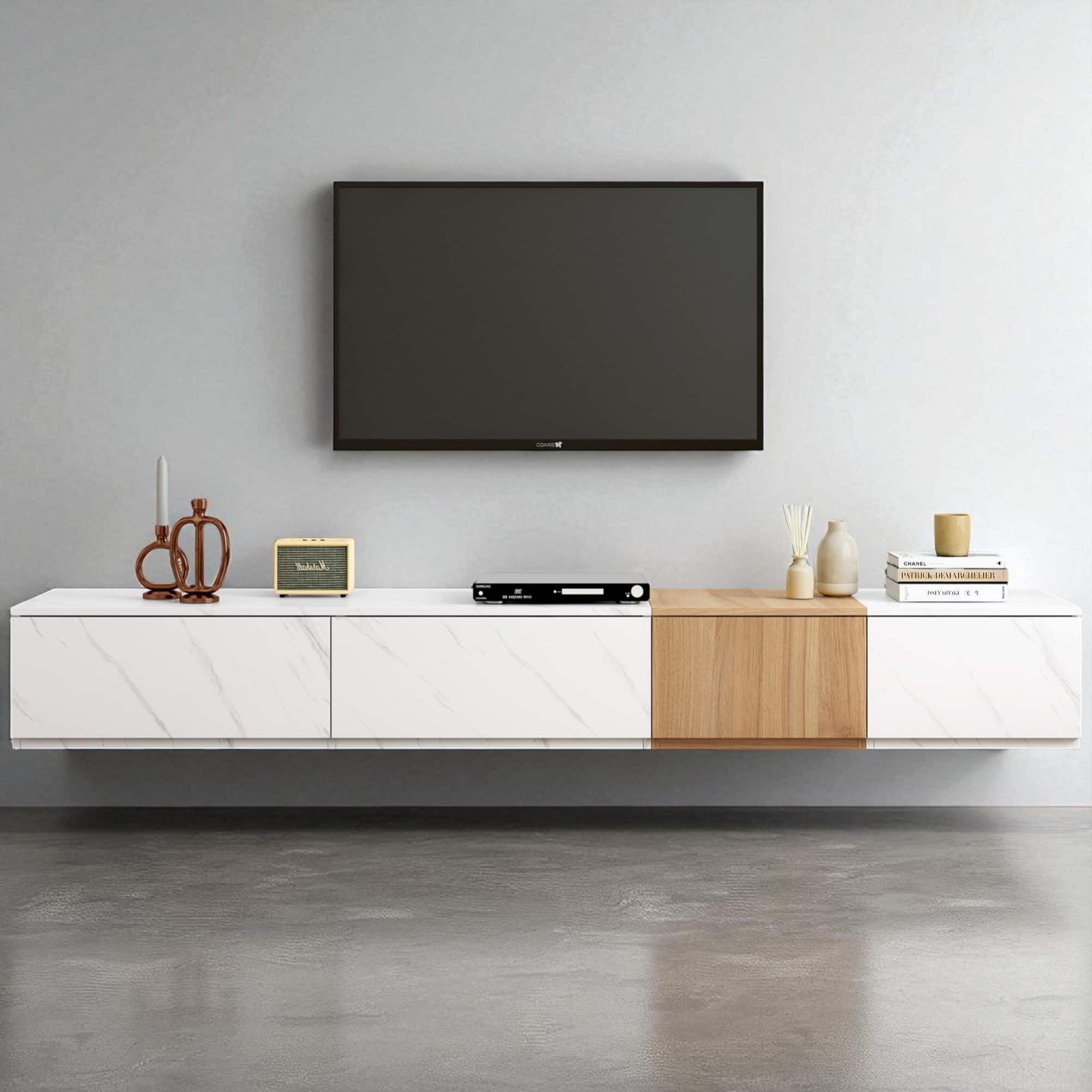 TV Stand with Faux Marble and Walnut Finish, Modular Entertainment Center with 4 Drawers for TVs up to 88 Inches