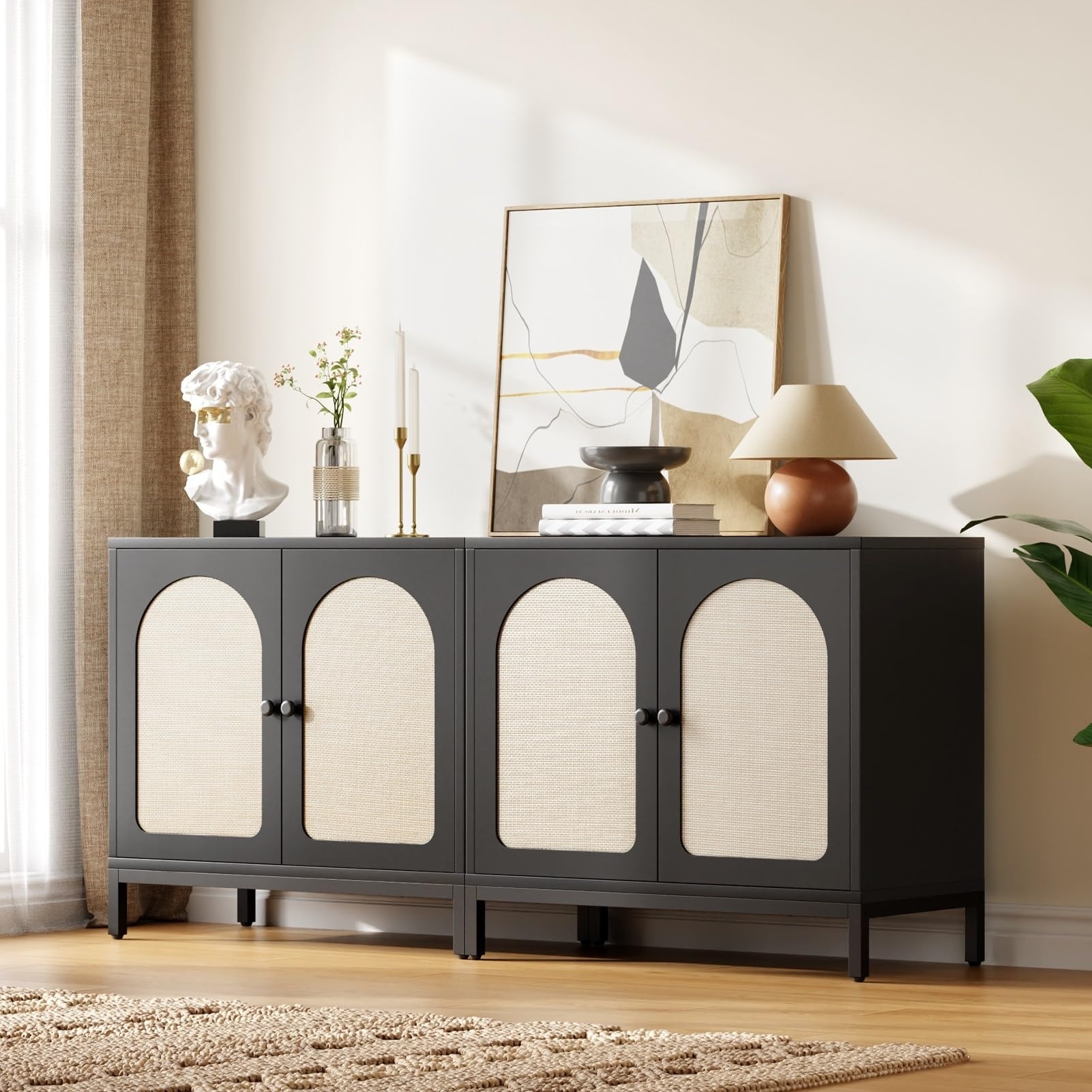 Rattan Sideboard Buffet Cabinet 2-Pack with Adjustable Shelves, Rattan Doors & Large Storage