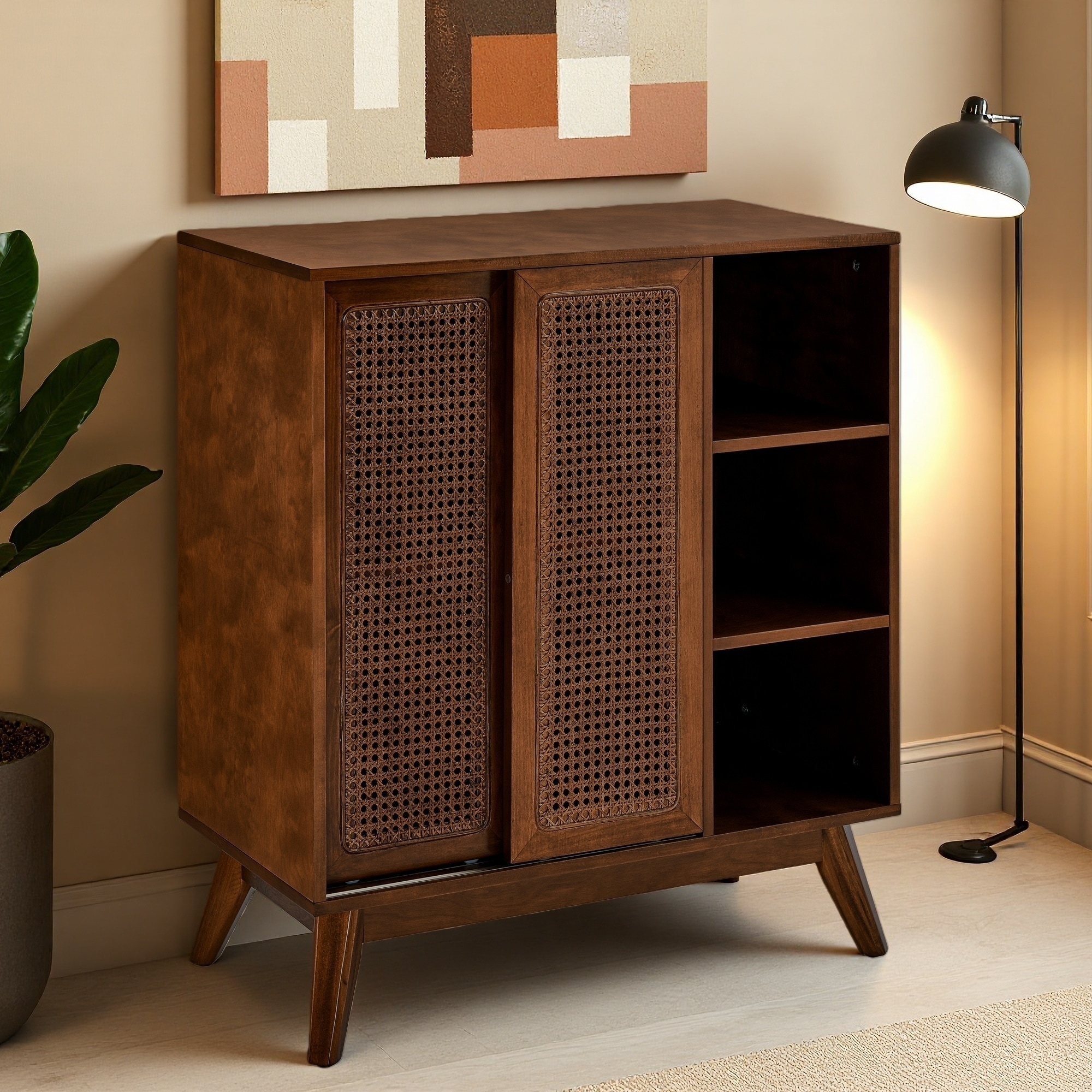 Mid Century Modern Rattan Sideboard Cabinet with Adjustable Shelves, Solid Wood Feet, Buffet Storage for Entryway, Living Room