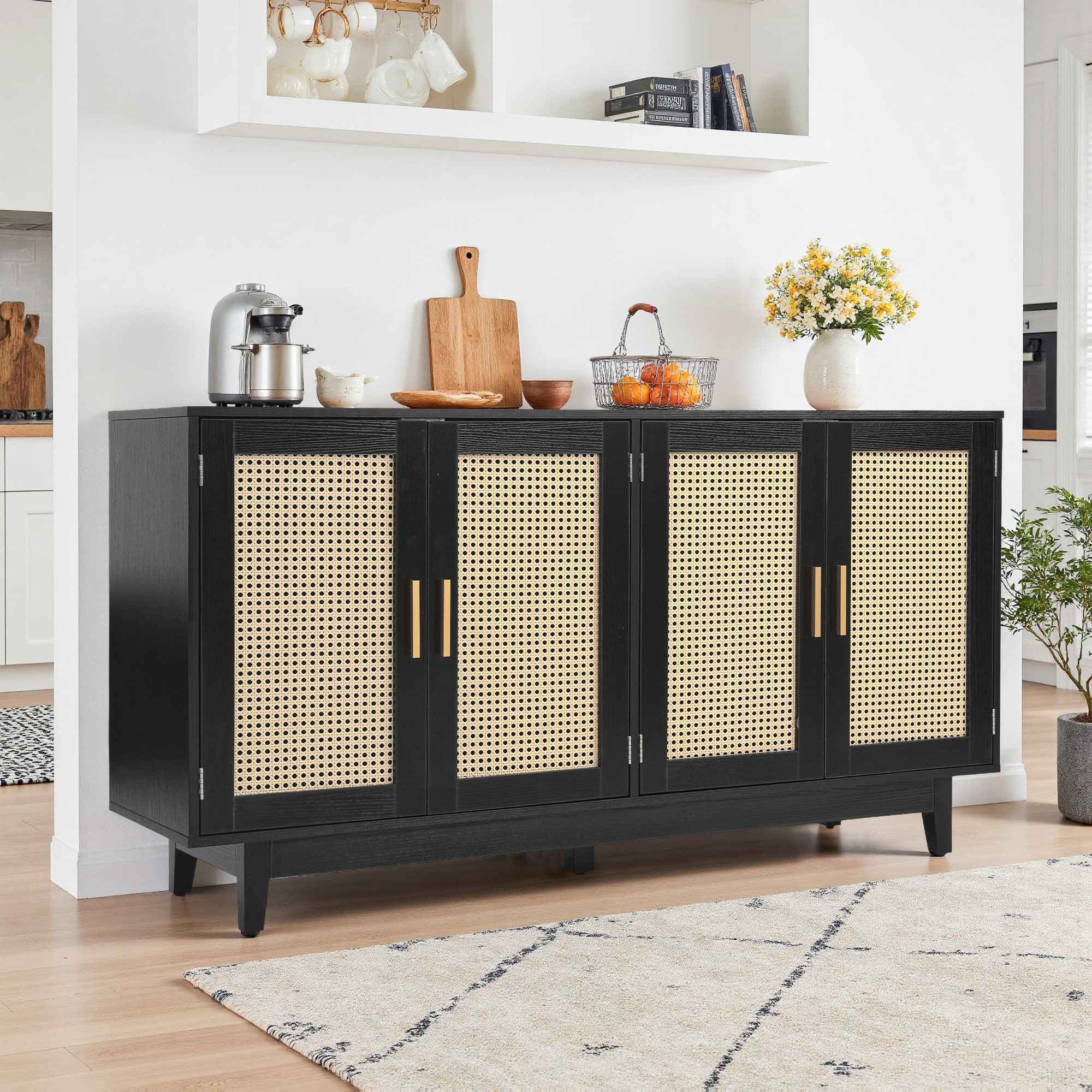 Modern 4 Door Wood Rattan Buffet Sideboard Storage Cabinet