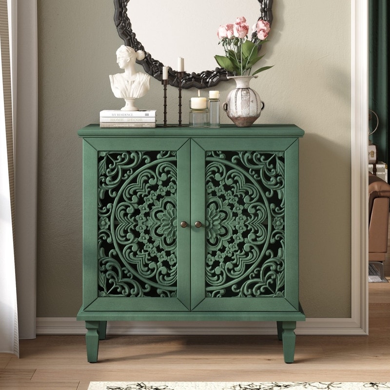 2-Door Vintage Hollow-Carved Accent Cabinet with Symmetrical Floral Design and Adjustable Storage Shelf