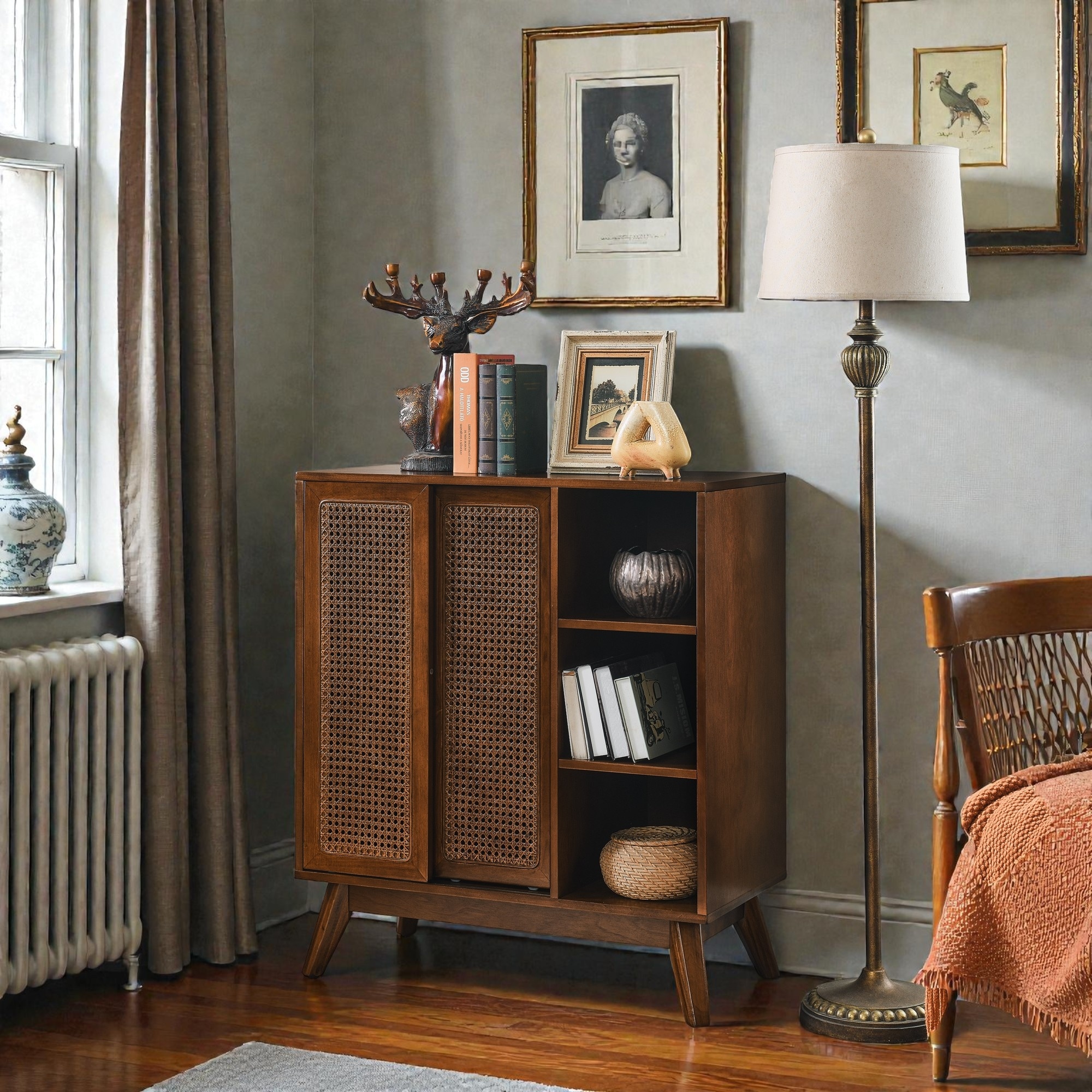 Rattan Sideboard Buffet Storage Cabinet with Adjustable Shelves, Entryway Cabinet with Open Display and Solid Wood Legs