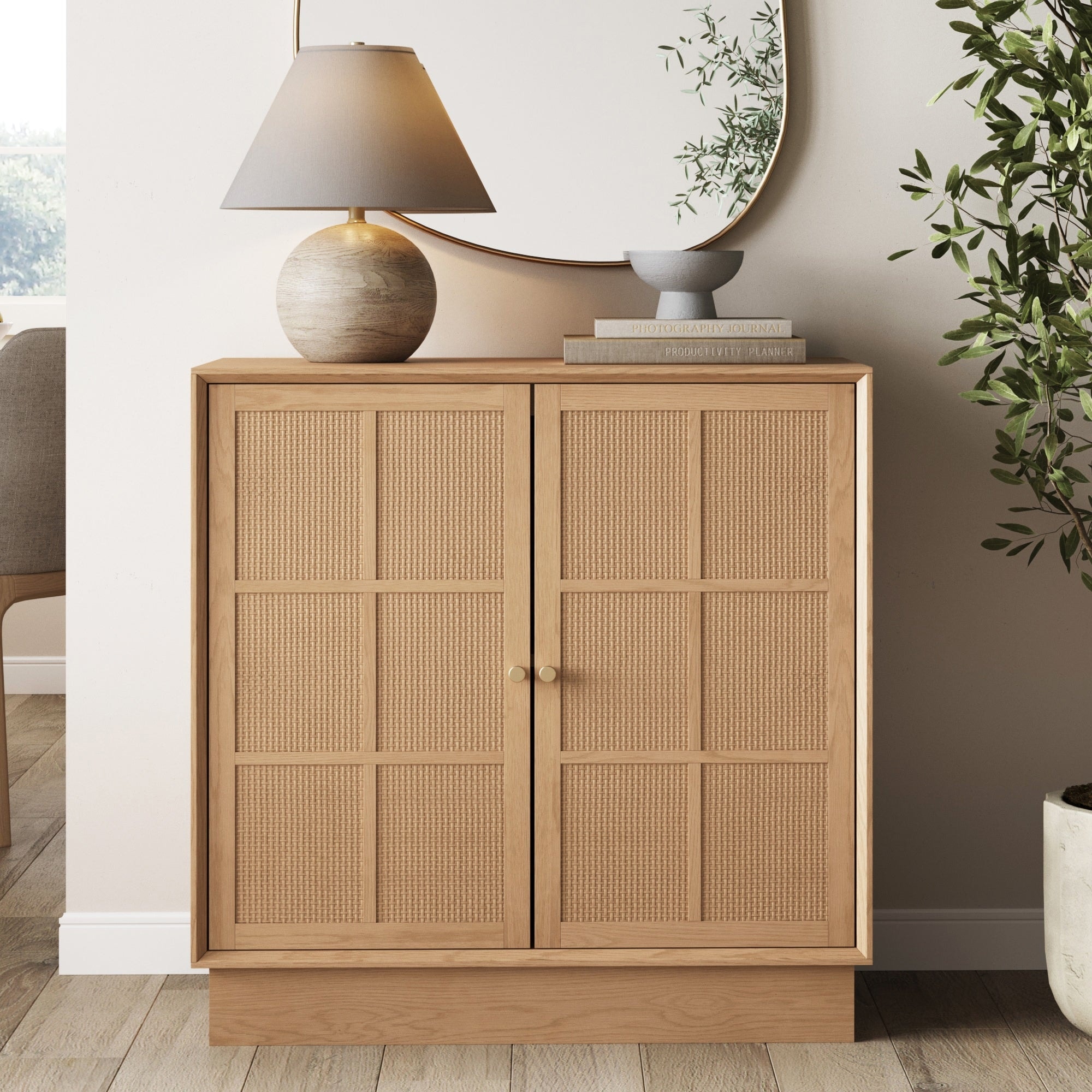 Elise Modern Coastal Rattan Storage Cabinet, Oak TV Cabinet Stand with Doors and Brass Door Handles