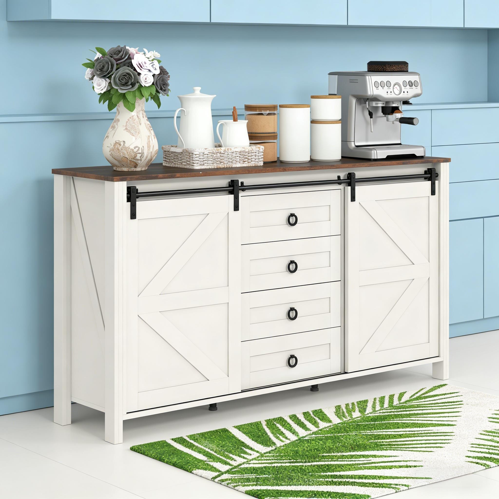 Farmhouse Sideboard Coffee Bar Cabinet with Sliding Barn Doors, 60" Large Buffet Storage Cabinet Entryway Cabinet TV Cabinet